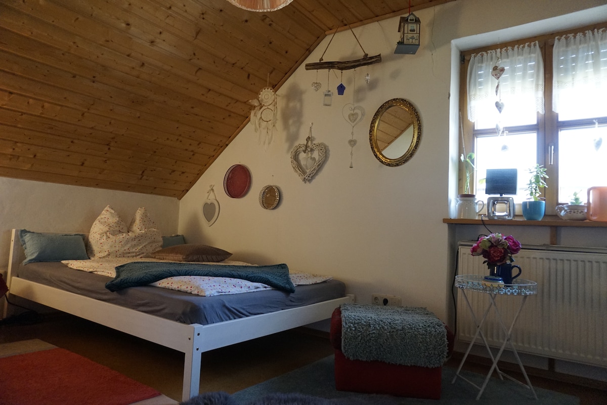 Surrounded by quiet nature you will enjoy this spacious apartment on the 1st floor of the old school-house. The house is encircled by a large garden and is located overlooking the village, the forests and fields. Those liking peace and tranquility and who are not afraid of a wood-burning stove, will feel at home here in the large rooms with a view of the Donautal. Day-trips, ski areas and cities like Passau and Regensburg are all well within a short car drive away.