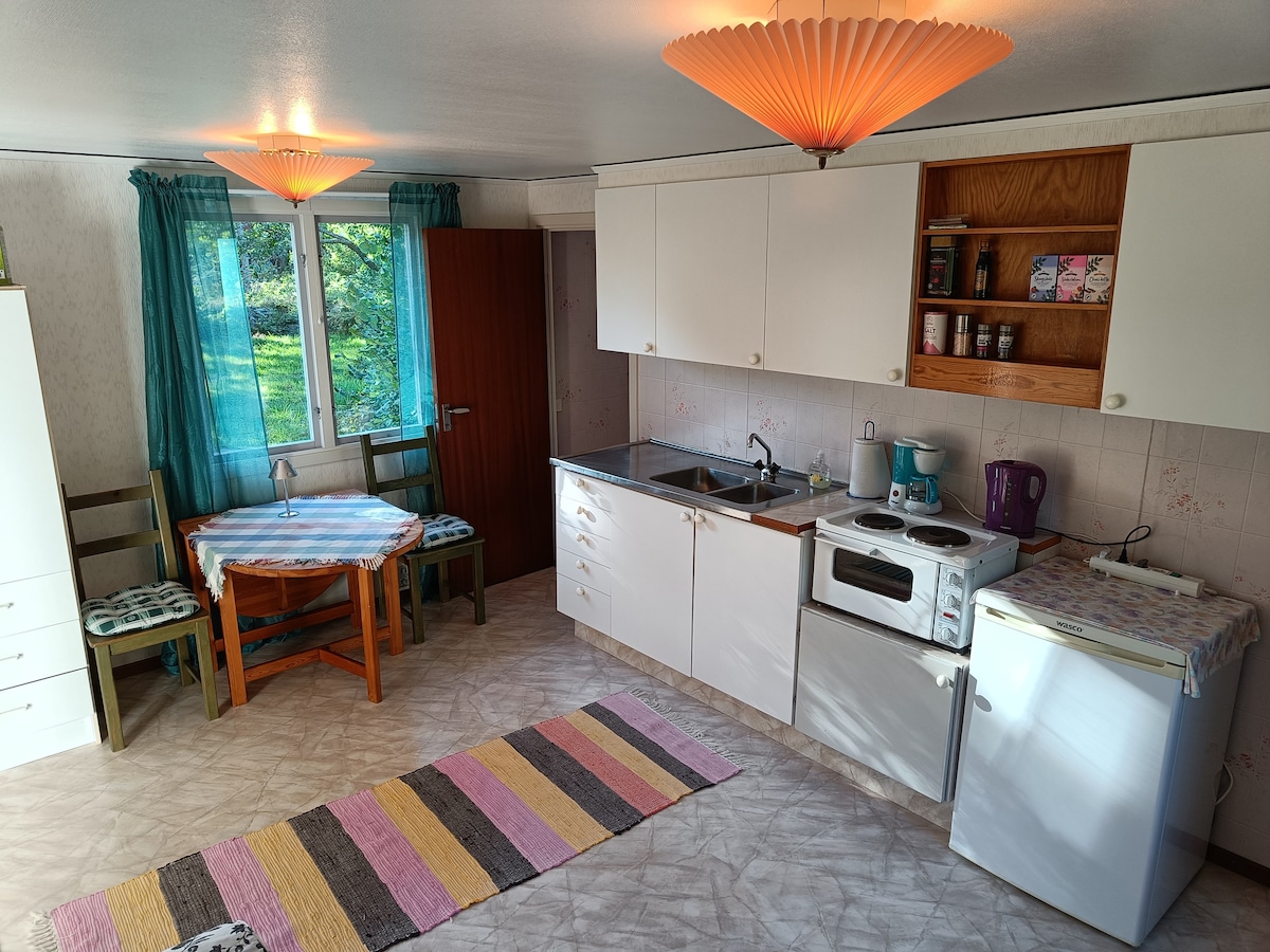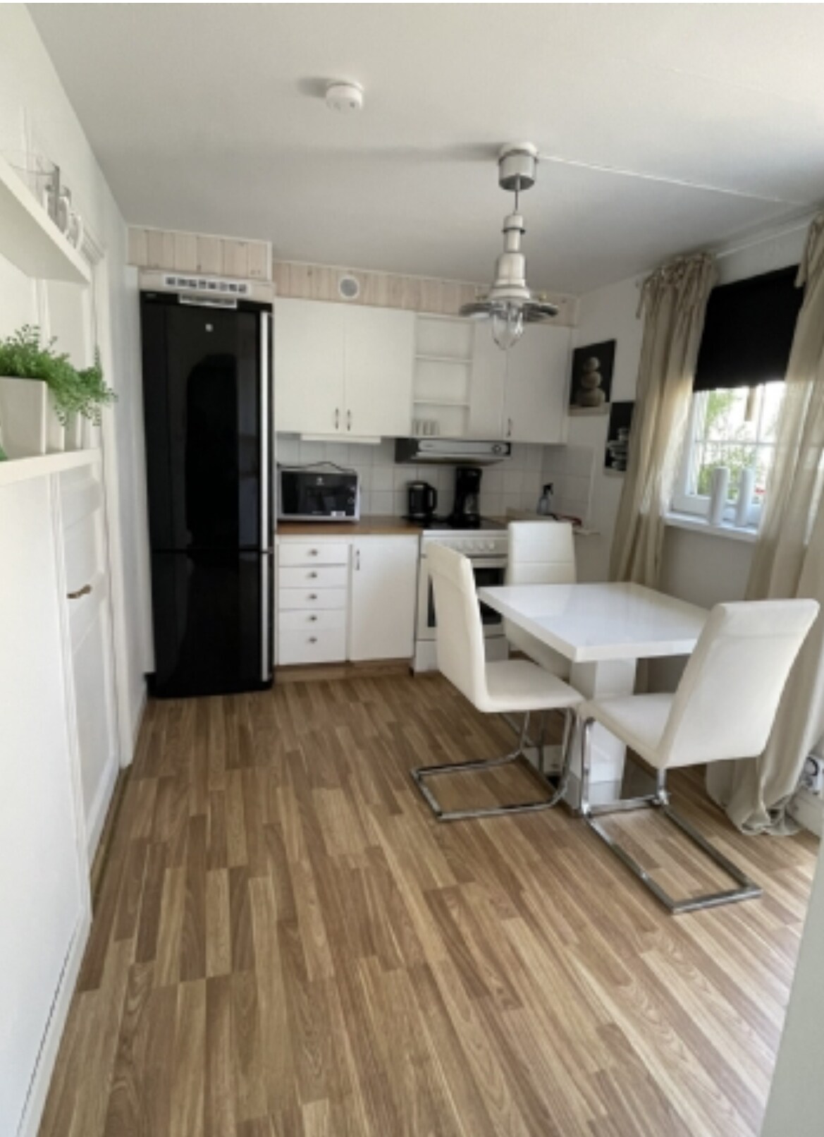 A charming cottage by the sea with a terrace facing the south. The terrace is furnished with a lounge set and bbq. Inside there is a fully equipped kitchen, a bath room with shower and incineration toilet. The living includes access to a small sand beach, a sauna and a pier with a floating dock for relax and bath. On the ground we have our main house and also free-range chickens and a wonderful cat. Feel free to pick your fresh breakfast eggs. Bikes, SUP and some fishing gear available