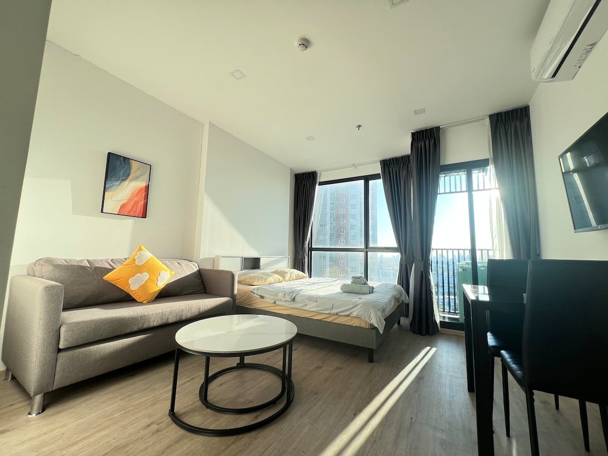 Apartamento de un dormitorio en el edificio más alto de OnNut, a lo largo de la línea de tren ligero Sukhumvit/ Gimnasio con piscina/ Traslado mensual desde y hacia el aeropuerto/ Cerca del metro/ Directo al centro de la ciudad de Wat Phra Chetuphon