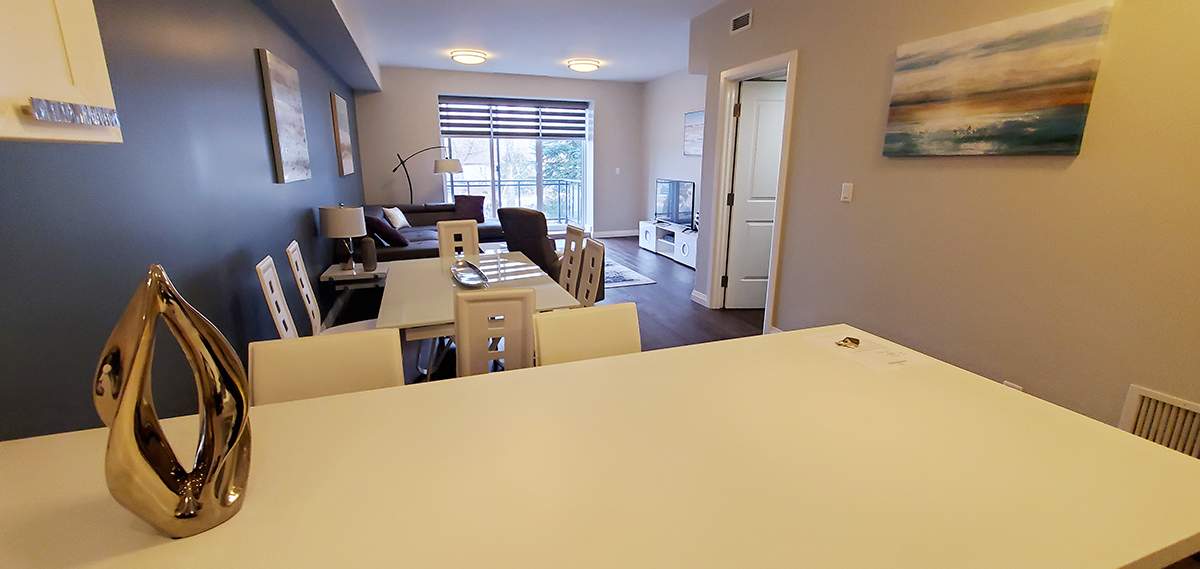 Welcome Home to our Executive One Bedroom Suite at our Luxury Nesbitt Drive location. At our neighbourhood of buildings, this modern suite is the finest stay that Sudbury has to offer. Our suites are masterfully designed with modern finishes, large open concept rooms and creative uses of space. Building amenities include on site fitness centre, executive boardroom and social room. Our location allows guests to easily commute to local attractions, outdoor spaces, shopping and institutions.
