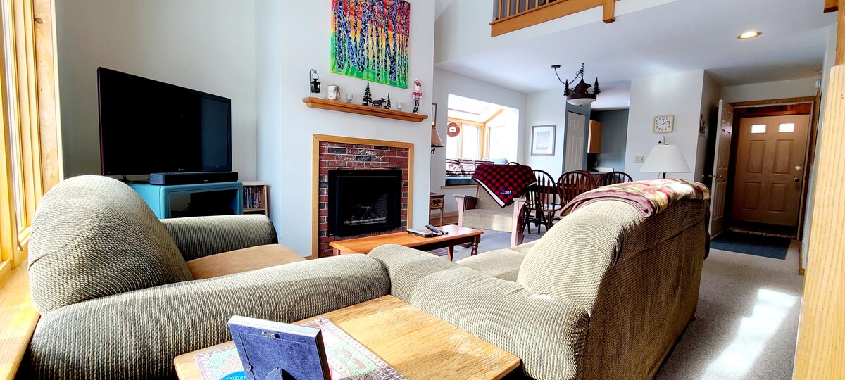 ¡Escapada a un apartamento de segunda planta en Sugarloaf Mountain! Dormitorio principal con cama tamaño queen; el dormitorio loft abierto del nivel superior tiene capacidad para 4 personas en 1 litera de dos camas individuales + 2 camas individuales; 2 baños completos; chimenea de gas; lavandería; encimeras de cocina de granito; y balcón privado. Extremadamente conveniente a 1 minuto a pie del telesilla Snubber, a 30 segundos a pie de la parada del servicio de transporte y fácil acceso al Sugarloaf Outdoor Center. Actividades durante todo el año: esquí alpino, esquí de fondo, raquetas de nieve, fat biking, ciclismo de montaña, golf, senderismo y mucho más.