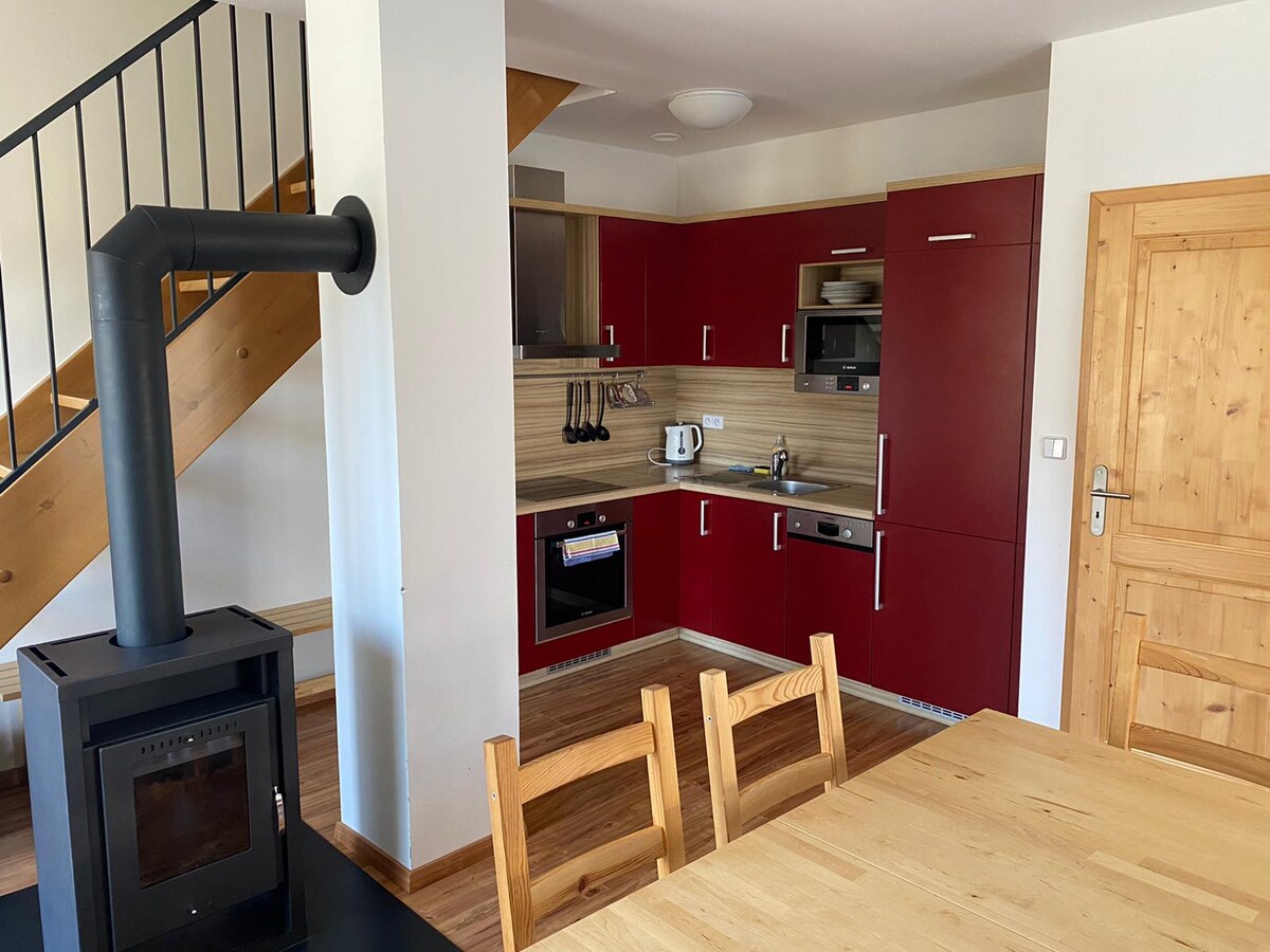 Apartamento moderno bellamente decorado en el corazón de Kvilda - Parque Nacional Šumava a solo unos pasos de la pista de esquí ( 100 metros ) y de todos los principales senderos para bicicletas. Disfruta de magníficas vistas de la naturaleza y el parque nacional cercanos. El apartamento cuenta con WIFI de alta velocidad gratuito, cocina totalmente equipada con lavavajillas, fogones, microondas y nevera , baño totalmente equipado. Tiene capacidad para 3 personas + bebé y ofrece un dormitorio separado sobre la sala de estar ( accesible en las escaleras ) y sofá plegable en la sala de estar.