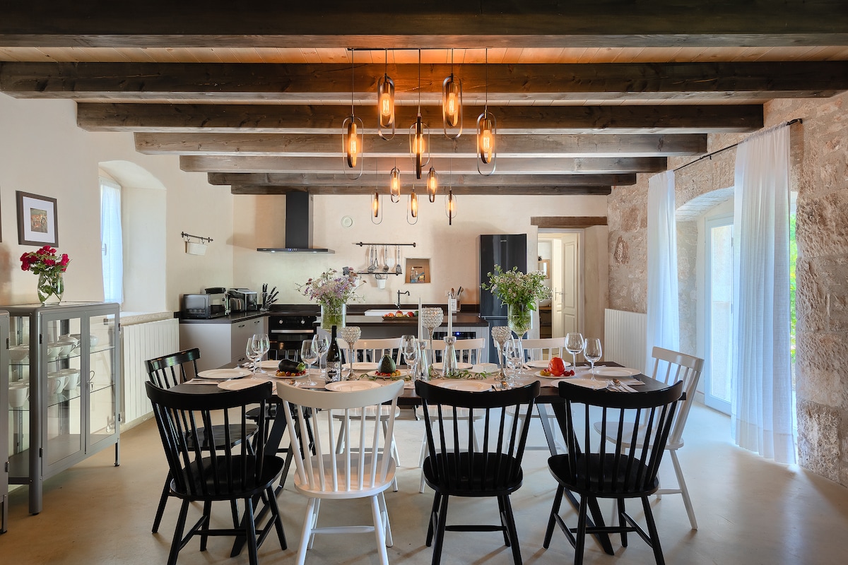 Bienvenido a Villa Tupljak, tu santuario privado en la cima de una colina en el corazón de Istria, un refugio que recuerda a un castillo en una colina. Esta gran villa de tres pisos, que se extiende sobre 220 metros cuadrados, puede alojar cómodamente hasta 12 huéspedes en tres apartamentos modernos y autónomos. Cada espacio está cuidadosamente diseñado con cocinas totalmente equipadas, cómodas salas de estar y lujosas habitaciones, todas con ventanas panorámicas que revelan impresionantes vistas del valle, los viñedos y los olivares.
