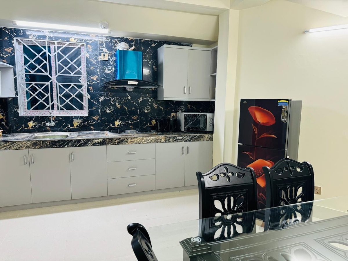 Una impresionante villa de 5 dormitorios situada en Sylhet (Islampur), un montón de espacio para que la familia disfrute de una estancia en Bangladesh. Entrada privada cerrada para un amplio estacionamiento y seguridad para tu tranquilidad. Espacio: 5 dormitorios 4 baños ( x2 en suite) 4 camas tamaño queen 1 cama de dos plazas 1 Cocina 1 Comedor 1 sala de estar 1 Balcón Amplio estacionamiento seguro con puerta cerrada Vecindario amigable Cuidador en el lugar para facilitar las necesidades Otras notas: Wifi de alta velocidad. Televisión inteligente Aire acondicionado Generador