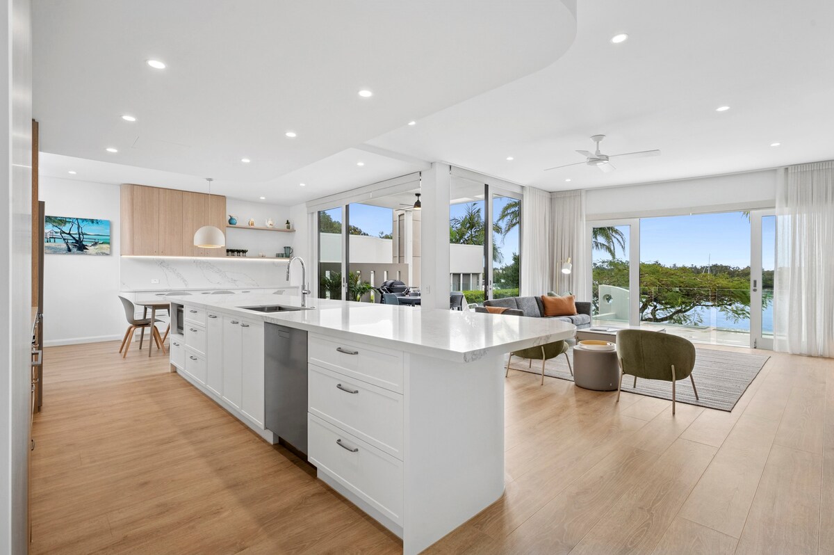Villa de lujo en Noosa Lakes con vistas al lago y al atardecer