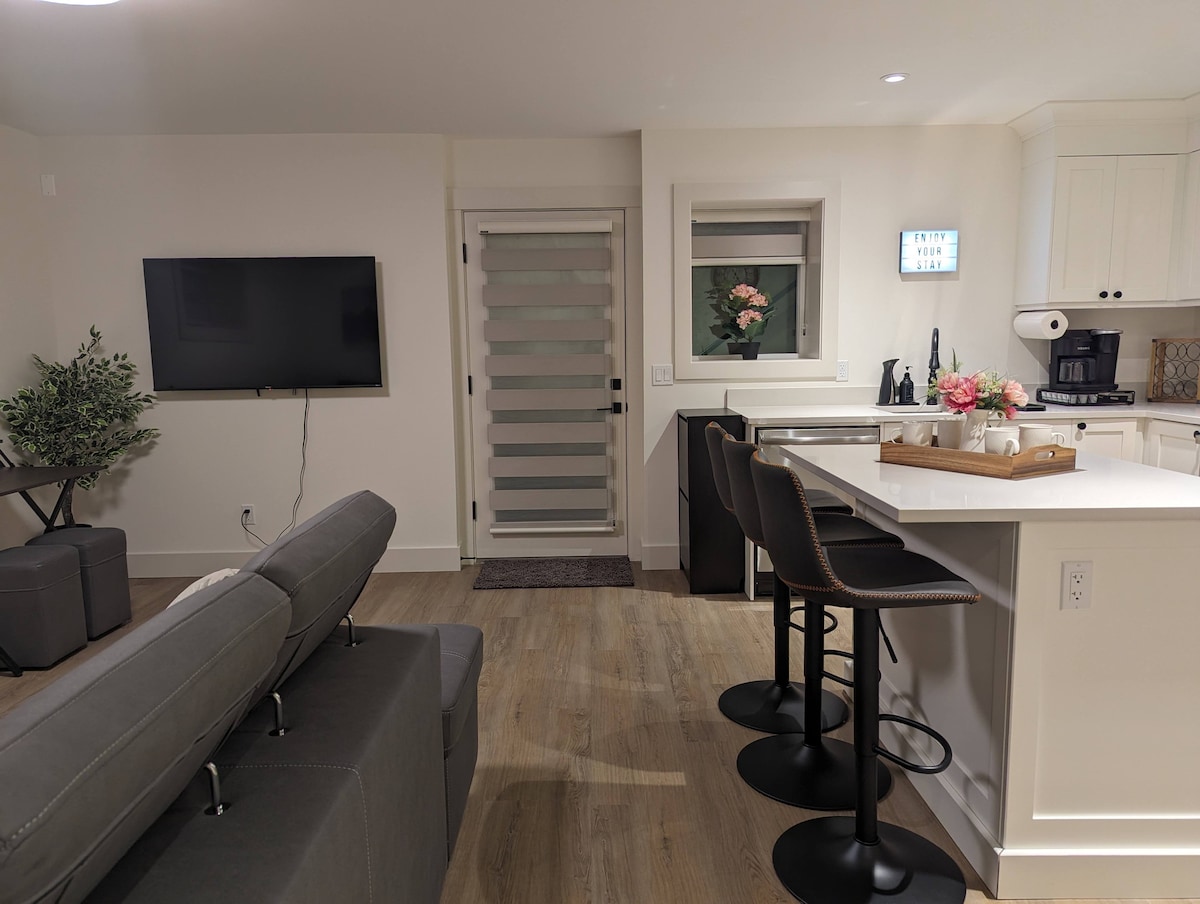 Bienvenido a nuestra nueva suite de un dormitorio en la tranquila White Rock/South Surrey. Convenientemente cerca de la frontera con Estados Unidos, Langley, Cloverdale, White Rock, Richmond y Vancouver, nuestra ubicación es perfecta para explorar. A solo un minuto de la entrada/salida de la autopista, nuestro espacio impecablemente limpio, acogedor y bien diseñado garantiza una estancia cómoda. Nos comprometemos a proporcionar un ambiente excelente y acogedor para tu relajación y disfrute.