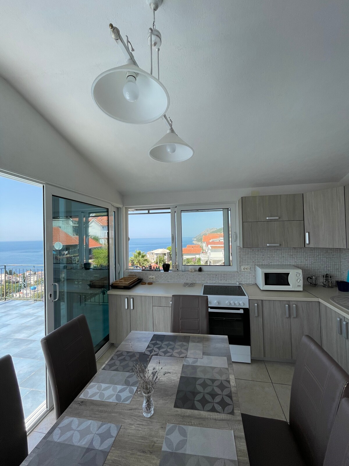Departamento de dos dormitorios (ático) con una gran cocina y sala de estar. Alojamiento cómodo para un máximo de 5 personas. Preciosas vistas al mar y a la montaña desde una enorme terraza ( 40 metros cuadrados). A 7-10 minutos a pie de la playa. Cocina totalmente equipada, estacionamiento. La recogida en el aeropuerto es posible). Aire acondicionado, TV,lavadora, horno, nevera, secador de pelo, plancha, ropa de cama, toallas.