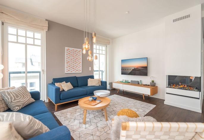 Bienvenido al apartamento «Alva», tu elegante refugio en el «DECK9 am Haff» en la isla de Usedom. En 145 m² encontrarás tres dormitorios, una sala de estar y comedor de planta abierta con vistas panorámicas, dos baños, aseo, chimenea de gas, aire acondicionado y wifi. Puedes disfrutar de la fantástica vista privada al puerto desde la gran terraza solárium. Apto para familias, con jardín, zona de juegos, barbacoa, sauna y bañera de hidromasaje. La playa del mar Báltico está a solo 10 km. Lujo y tranquilidad en Usedom: ¡reserva ahora!