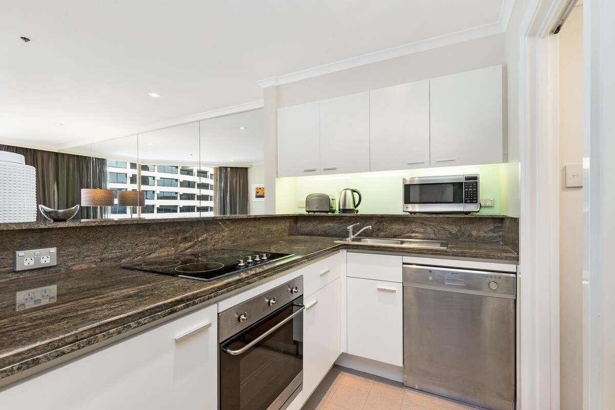 Disfruta de una elegante escapada en este apartamento céntrico de Sídney a pocos pasos de todos los lugares de interés principales. Un apartamento espacioso y bien equipado de un dormitorio con un nuevo sofá cama tamaño queen en el salón y un espacio de trabajo separado. El apartamento tiene una lavandería interna con lavadora y secadora, y la cocina tiene lavavajillas y todo lo que podrías necesitar para una estancia sin estrés. Las comodidades en la azotea de este apartamento con servicios son sensacionales, como una piscina, una bañera de hidromasaje, una sauna y un nuevo gimnasio.