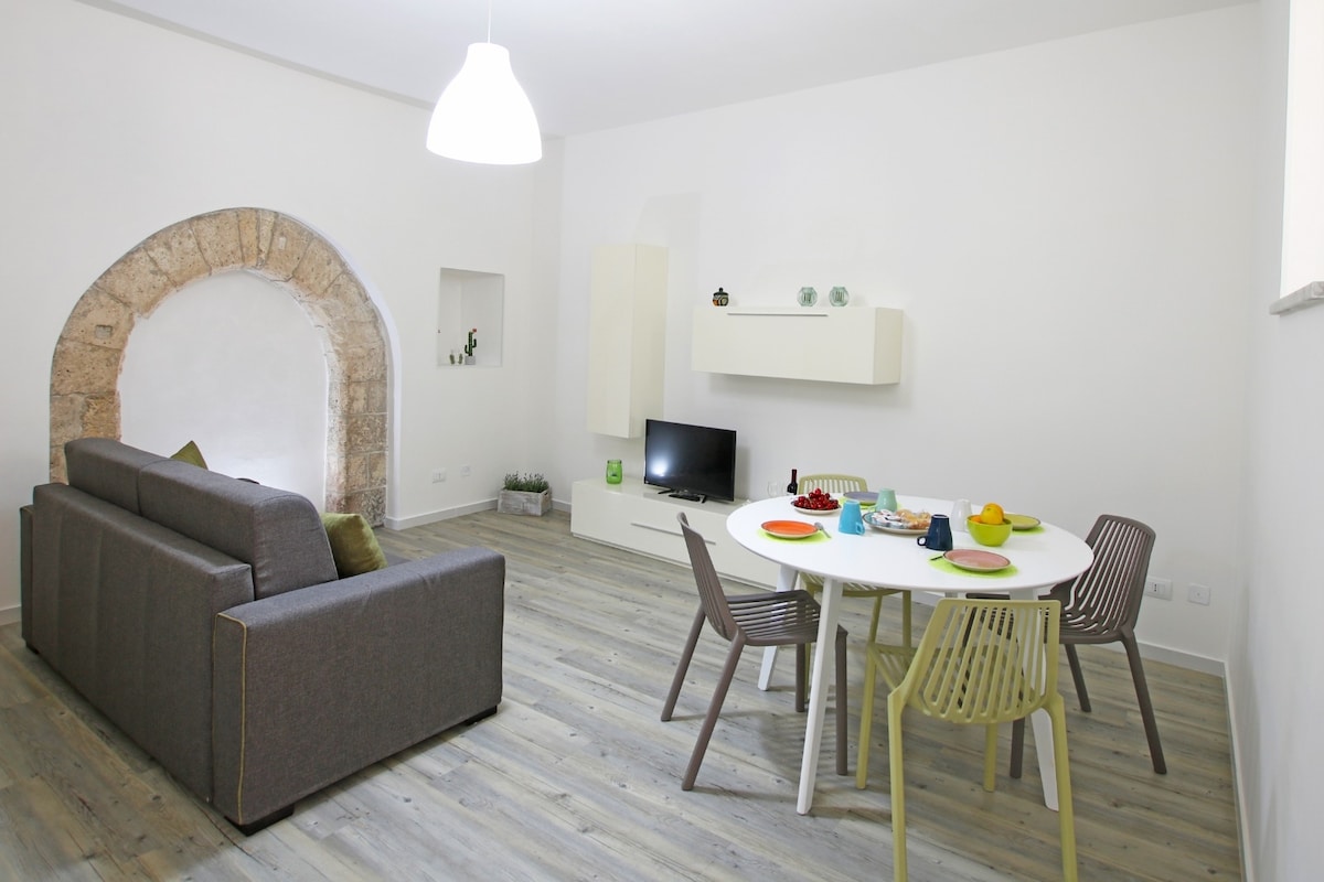 Dionisio 6 es un apartamento elegante, acogedor y cálido en la planta baja, ubicado en el barrio judío de «La Giudecca», en el corazón de Ortigia, a solo 50 metros del mar. Nuestro loft ha sido completamente renovado en 2021 a través de una cuidadosa restauración conservadora utilizando materiales de la más alta calidad con el fin de respetar las características del antiguo edificio en el que se encuentra. La funcionalidad y el diseño se han mezclado con la antigüedad de la estructura arquitectónica.