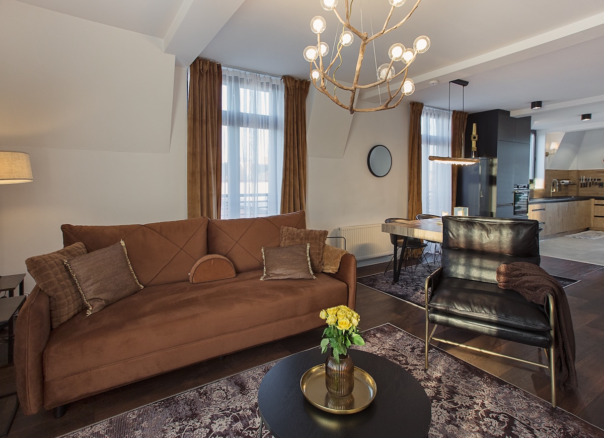 Loft Amalia – a unique flat in a historic fire tower Here, history meets the elegance of contemporary design. Loft Amalia, with a floor area of 85 m², is situated in a prestigious building. The most remarkable feature of the interior is the bedroom located within the original fire tower dating from 1892. ✨ a spacious living room with a projector and screen ✨ panoramic natural light thanks to windows facing three directions ✨ an elegant bathroom with a walk-in shower ✨ a stylish biofireplace