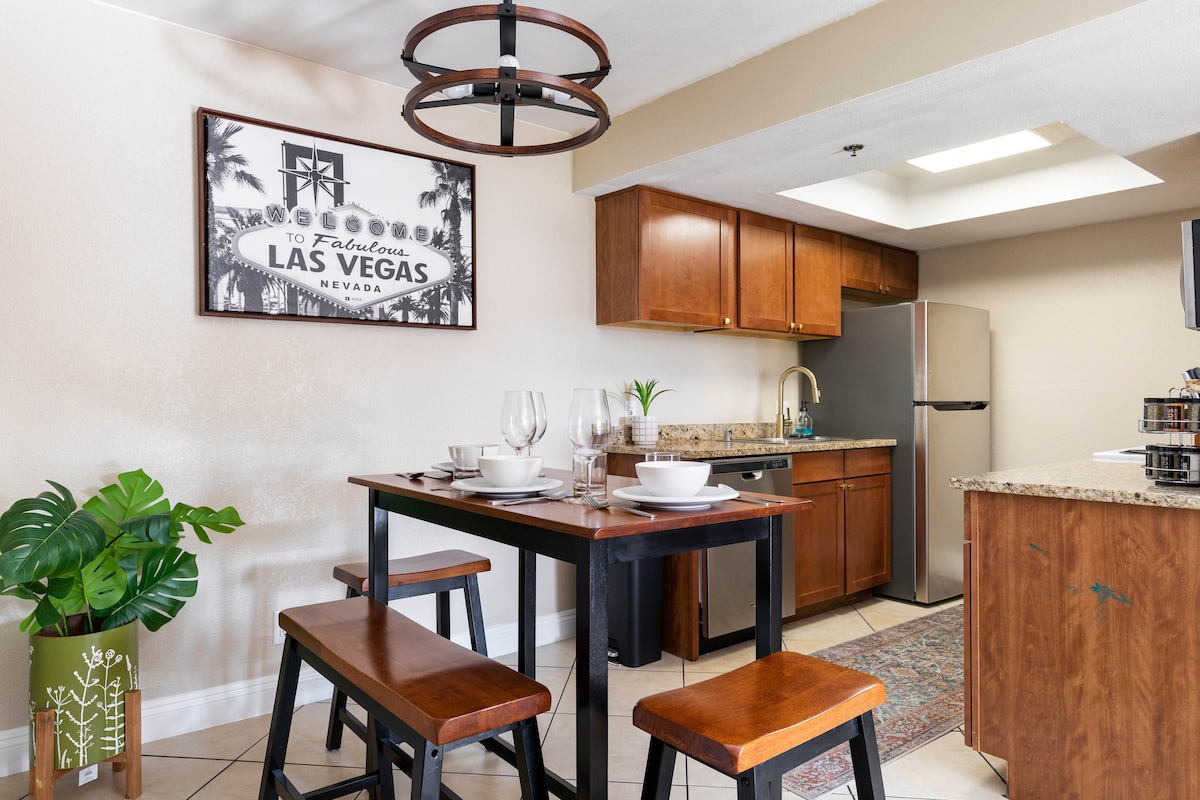 Esta suite tipo estudio de 631 pies cuadrados está totalmente equipada y es perfecta para personas o grupos pequeños que quieran vivir la experiencia de Las Vegas mientras disfrutan de las comodidades de un hogar. Este lujoso estudio es a la vez amplio y acogedor, con unas vistas increíbles. Este estudio tiene capacidad para un máximo de 4 personas con una cama tamaño king y un sofá cama extraíble de tamaño completo. • SIN TASA DEL CENTRO VACACIONAL • Wifi gratuito. • Acceso a la piscina y al gimnasio. • A poca distancia a pie del Strip de Las Vegas y TopGolf. • Aparcamiento gratuito.