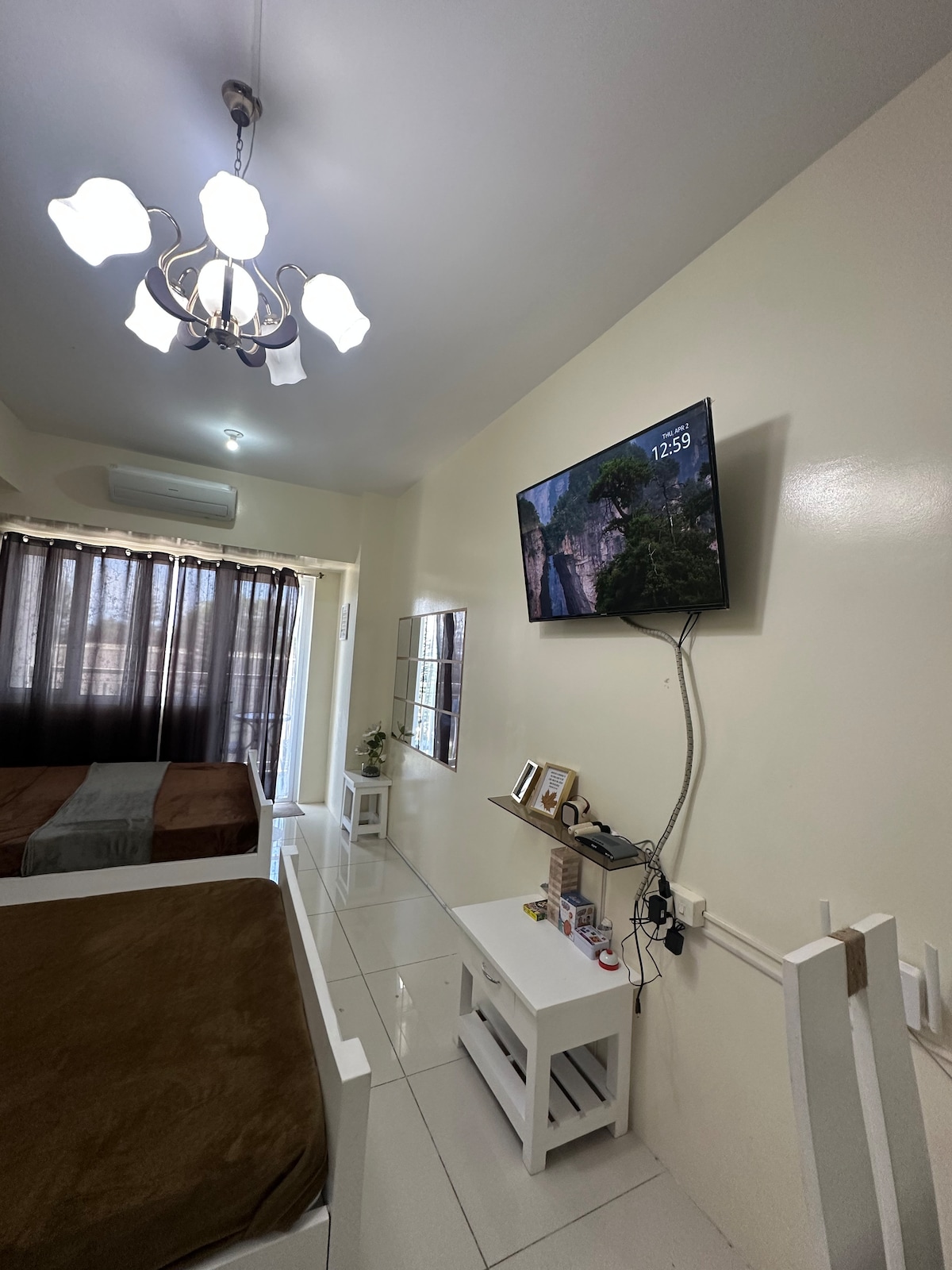 The Crest en Wind Residences Tagaytay (Vista al lago Taal/autopista) Características: Smart TV de 55 pulgadas (con cuenta dedicada de Netflix) Wifi (30-50 Mbps) Microondas Mini-nevera (puerta doble) Hervidor eléctrico Aire acondicionado Samsung de tipo dividido Perchero y perchas móviles. Baño con calentador de agua y bidé. Jabón personal y cepillo de dientes gratuitos. Uso de toallas (solo 2 piezas por reserva) Distribución de las camas: Cama doble (para 2 personas). Sofá cama grande (para 2 personas)