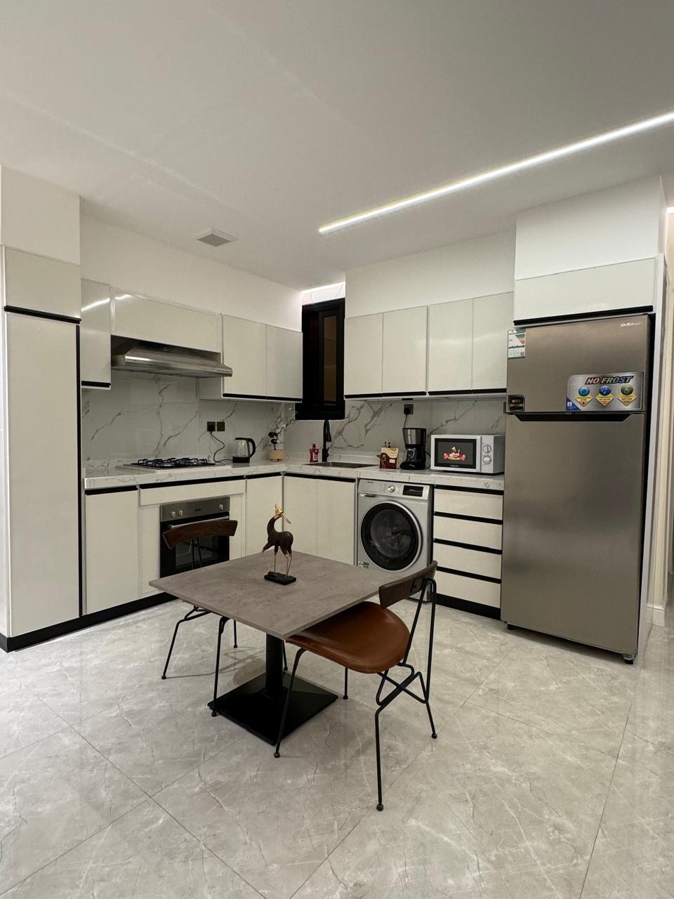 Este apartamento está diseñado con un diseño hermoso y distintivo, un apartamento tranquilo y seguro con un diseño cómodo cerca de todos los servicios, restaurantes internacionales, cafeterías y centros comerciales. Consta de un dormitorio con una cama grande, una sala de estar y un pequeño techo ^-^ y un rincón de café, un hervidor de agua y una pantalla de 60 pulgadas. Una cocina integrada con utensilios de cocina, horno, nevera, microondas, lavadora y jabón de manos ubicado en el segundo piso, su edificio residencial (no hay ascensor) es una zona muy tranquila y segura y total privacidad como si estuvieras en tu casa.