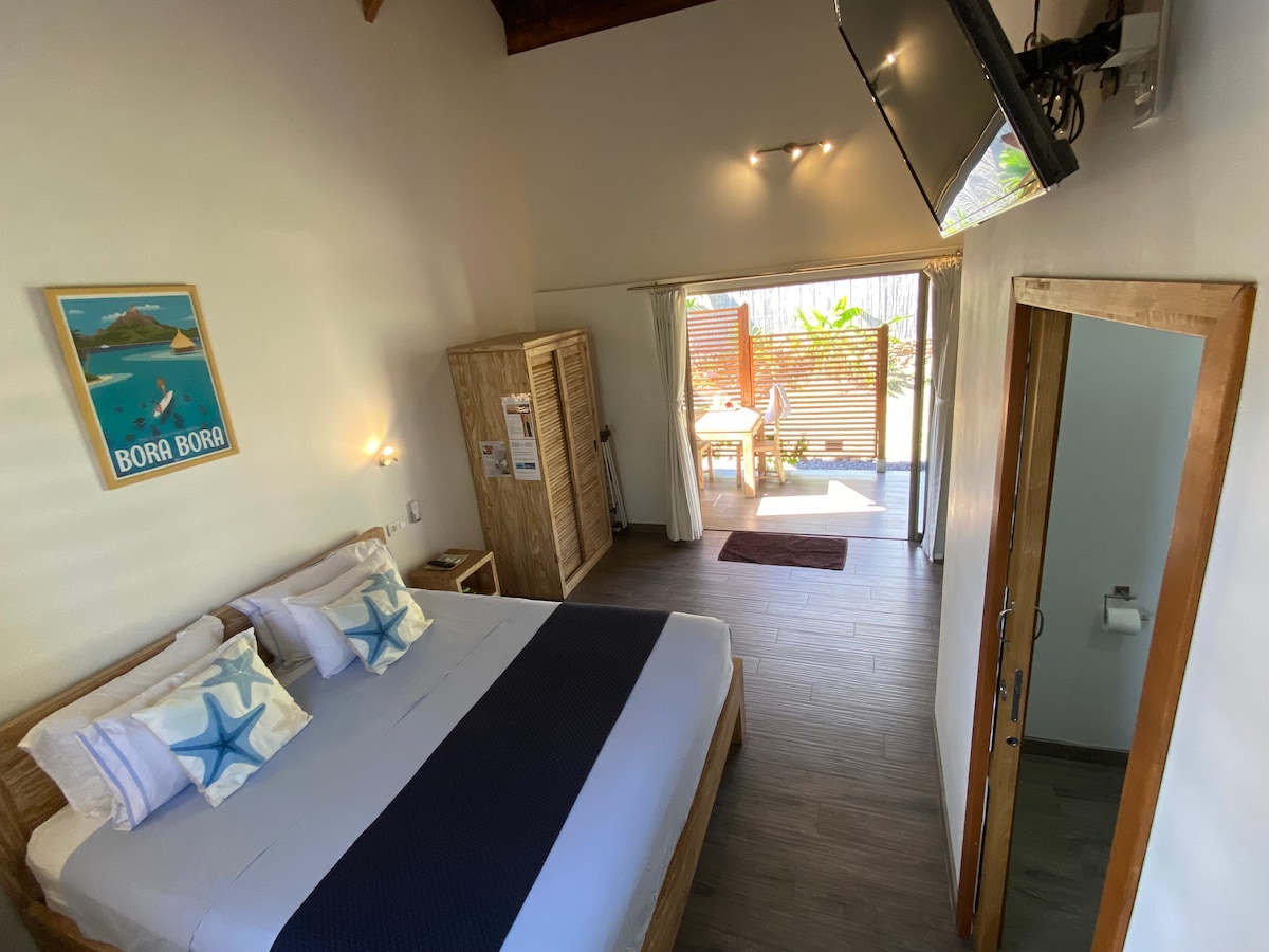 Este refugio Zen Colonial ofrece una escapada serena con un baño privado de estilo balinés y un gran espacio al aire libre compartido con vistas a un jardín tropical. Una zona exterior separada ofrece impresionantes vistas a la laguna. El estudio totalmente sellado garantiza la comodidad, mantiene a los insectos fuera y cuenta con internet de fibra de alta velocidad. Las tiendas están a 1 km en el pueblo de Papara, con la playa de surf Taharuu a 4 km y el campo de golf Atimaono a 6 km. Ubicado a 200 metros de la carretera, la ubicación es tranquila y silenciosa.
