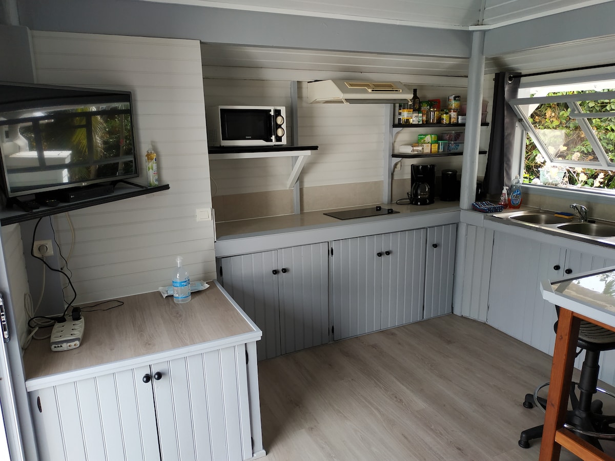 Cabaña ubicación privilegiada en lugar único y tranquilo. Pequeño rincón del paraíso, déjese mecer por el chapoteo del agua, frente y al borde de la laguna Pequeño estudio con ducha al aire libre, cama doble 160x190 con ventilador y ropa de cama. Estilo cabaña de pescador atípico. Rincón de cocina equipado A su disposición un kayak de 2 plazas para sus paseos. A su llegada, tendrá las sábanas, las toallas. Alojamiento desinfectado 1 vez al mes por la empresa Fenua Clean T