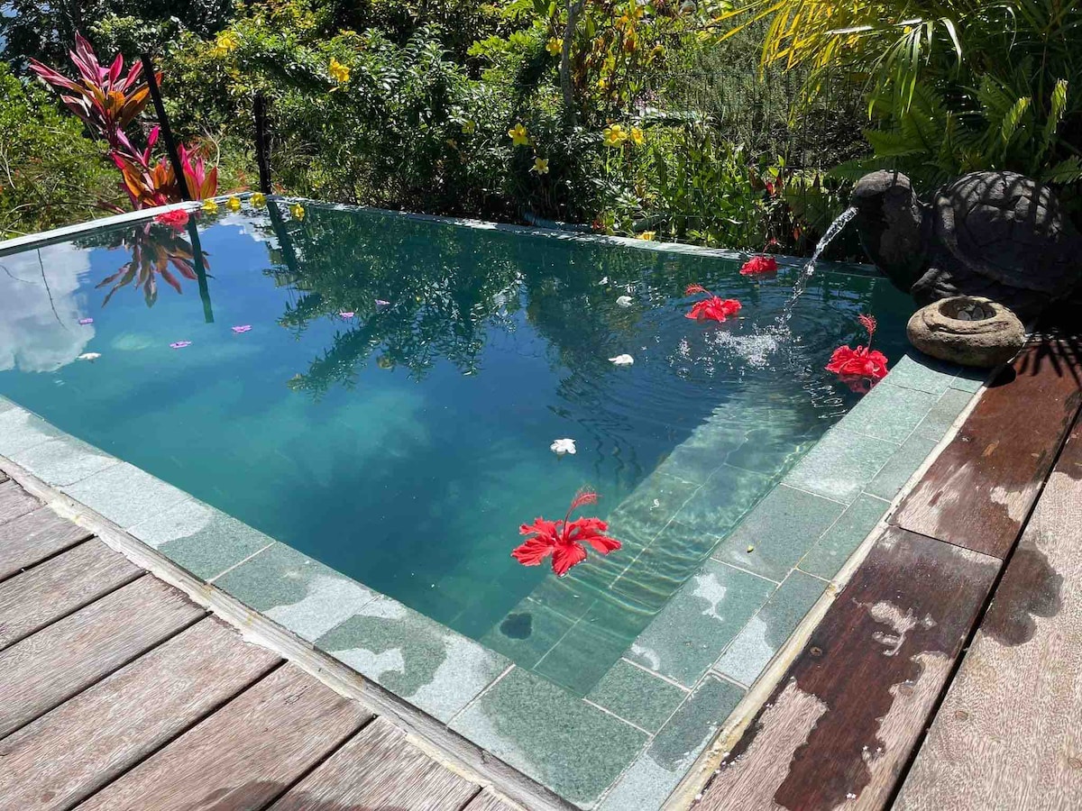 Acogedor bungalow con piscina – Playa a 2 minutos a pie Ia Ora Na ! Encantador bungalow independiente en nuestra finca familiar, frente al mar y a 2 minutos de la playa. Cerca de nuestra casa, ofrece tranquilidad, privacidad, seguridad y acceso privado a la piscina. Las ballenas pasan muy cerca: podrá observarlas desde la terraza. Un lugar ideal para recargar las pilas entre naturaleza, senderismo y momentos preciosos.