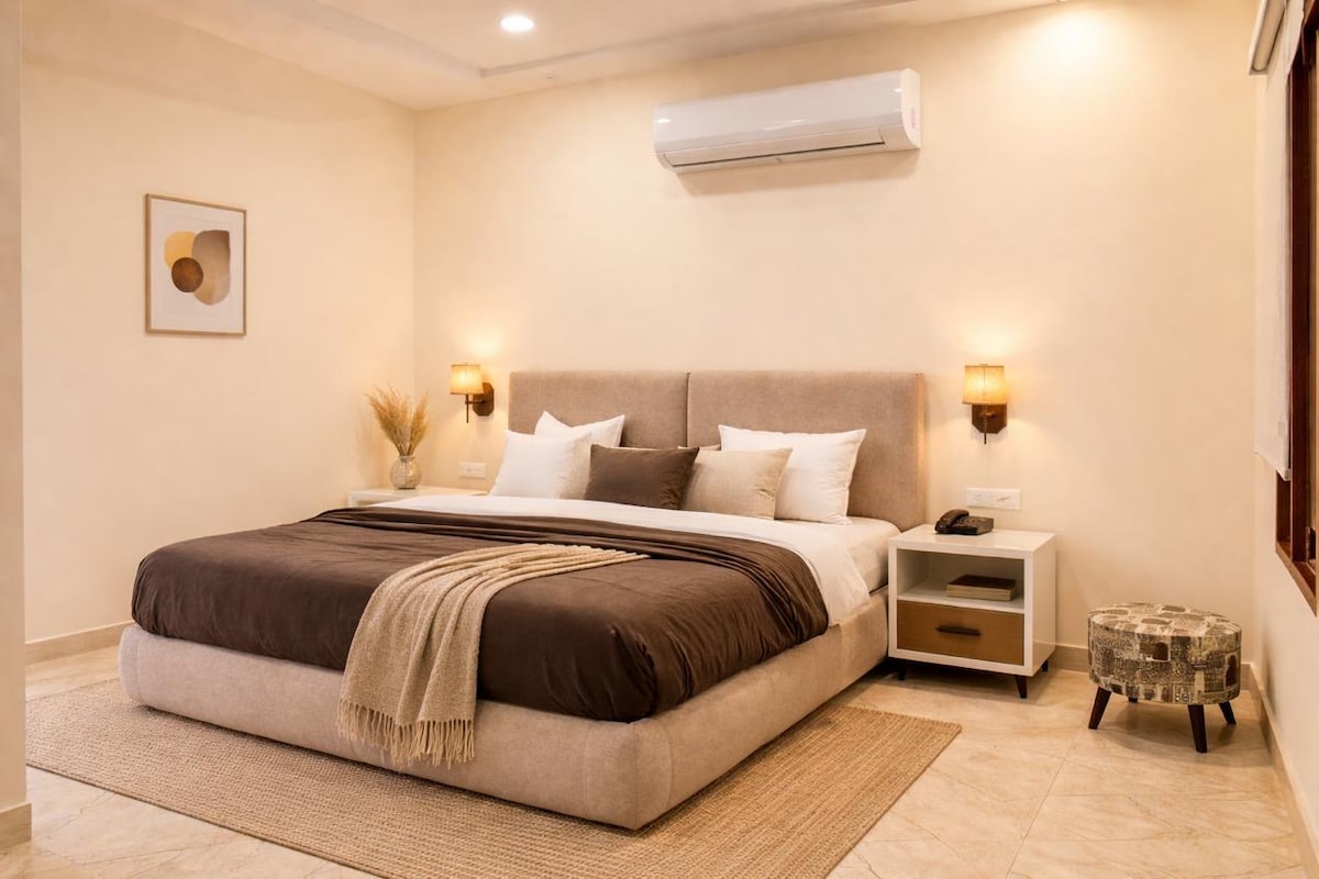 Welcome to Maskaa, a stylish 2BHK apartment with a warm bohemian vibe, thoughtfully designed for comfort and relaxation. Perfect for families or small groups, the space comfortably accommodates up to 6 guests, with two cozy bedrooms and an additional queen-size bed in the living room. Enjoy a spacious, beautifully curated home with a relaxed artistic feel, modern amenities, and a peaceful residential setting—ideal for unwinding after a day out.
