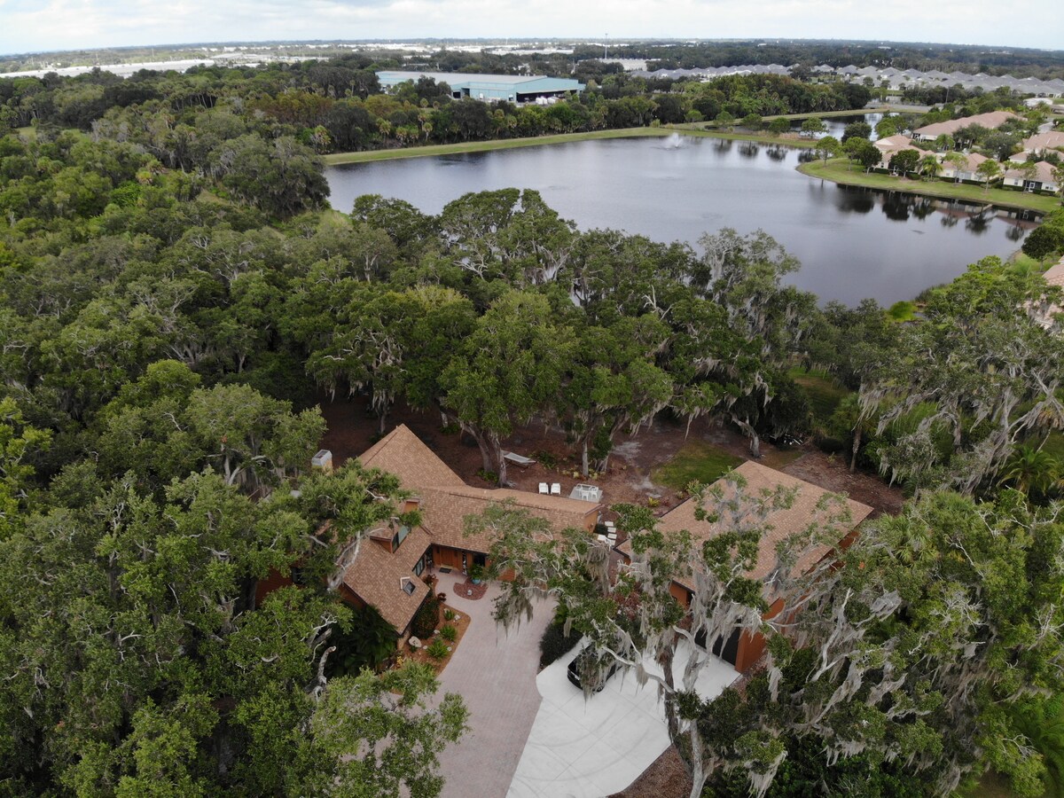 Situado en un barrio tranquilo y seguro, al final de un camino pavimentado de 400 pies, bordeado de viejos robles. El área de invitados se encuentra en un gran edificio independiente con su propia entrada segura en la planta baja. La unidad está provista de su propio aire acondicionado y calefacción. La «ducha de Florida» proporciona una gran experiencia de ducha al aire libre privada, con mucha agua caliente, bajo las estrellas. Ofrece una vista al lago de diez acres desde el interior o el exterior. Se avistan muchas especies de aves y vida silvestre, con 45 acres de bosque fronterizo.