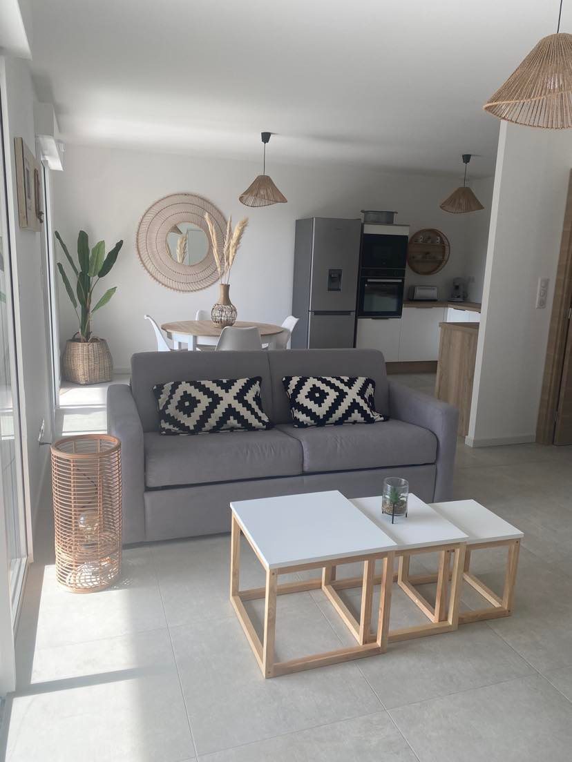 Impresionante apartamento de 70 m² en una pequeña residencia nueva y tranquila con dos plazas de aparcamiento gratuitas, que consta de dos dormitorios con aire acondicionado, una sala de estar luminosa, una cocina abierta, un lavadero con lavadora y una terraza de 11 m² con vistas abiertas. Wifi, televisión. Situado a 10 minutos de la playa, a 15 minutos de la montaña y el río y a 5 minutos de todos los servicios.