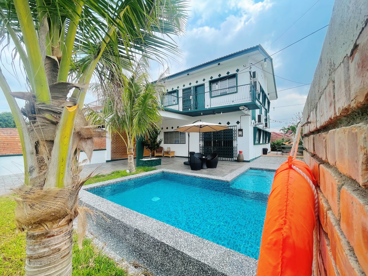 Cómoda vista al jardín de la piscina (máximo 24 personas) 1) Con 5 dormitorios con aire acondicionado - Habitación 1 (2 camas tamaño queen) - Habitación 2 (camas de dos pisos - 1 cama tamaño queen 2 camas individuales ) - Habitación 3 (2 camas tamaño queen) - Habitación 4 (1 cama tamaño queen + 1 cama individual). - Habitación 5 (camas 2Queen) 1)Amplia sala con mesa de billar 2) Piscina lúdica de 20 pies x 18 pies para adultos y niños con 3)Múltiples juegos : Mahjong, Rummy y Dices 4) Área de cocina: cocina de inducción, microondas, dispensador de agua y utensilios de cocina