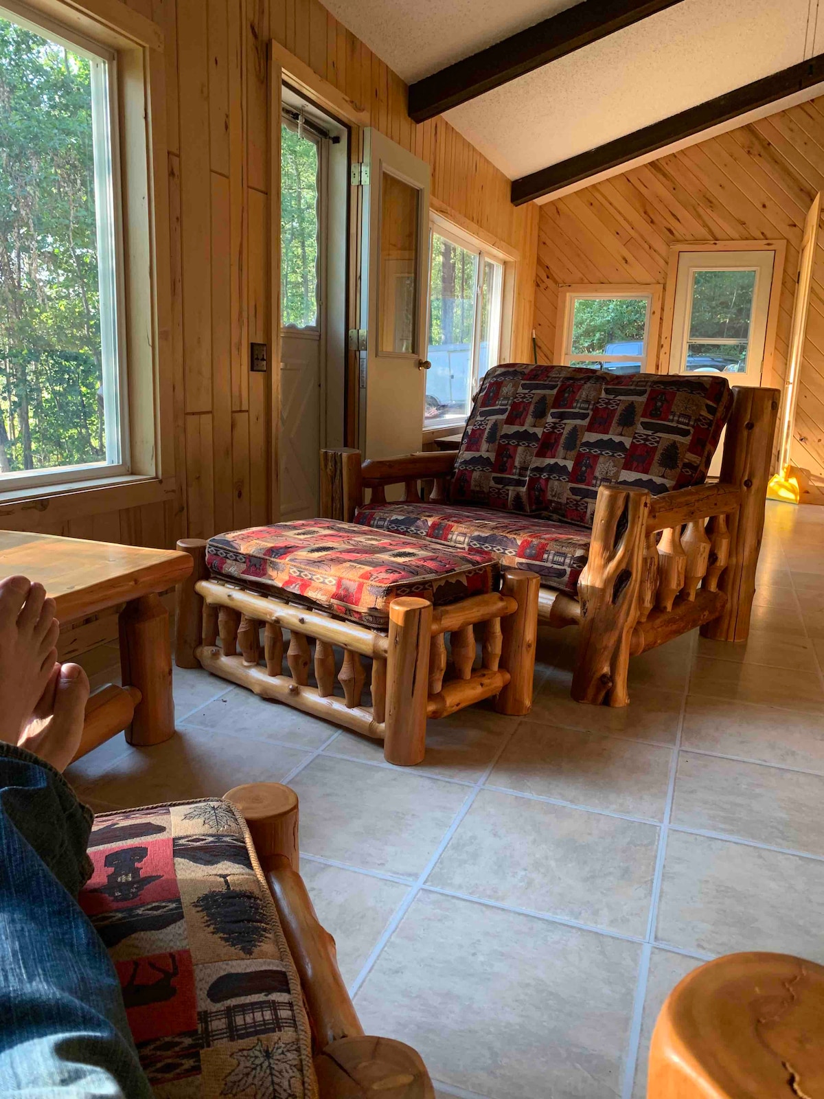 Esta moderna cabaña se encuentra a 390 pies del hermoso río Kettle. El río es muy conocido por su gran tubing, piragüismo y kayak. Hay chimenea de gas, jacuzzi y wifi. El jacuzzi más nuevo tiene capacidad para 6 personas. Amplia terraza con asientos. Fogata y una gran parrilla de gas. La cabaña está actualizada y es muy cómoda. ¡La ropa de cama es de Pottery Barn y los electrodomésticos de Kitchen Aid! Lavadora y secadora. Siete acres de bosque con comederos para ciervos y pájaros para la vida silvestre. ¡Esta cabaña es increíble!