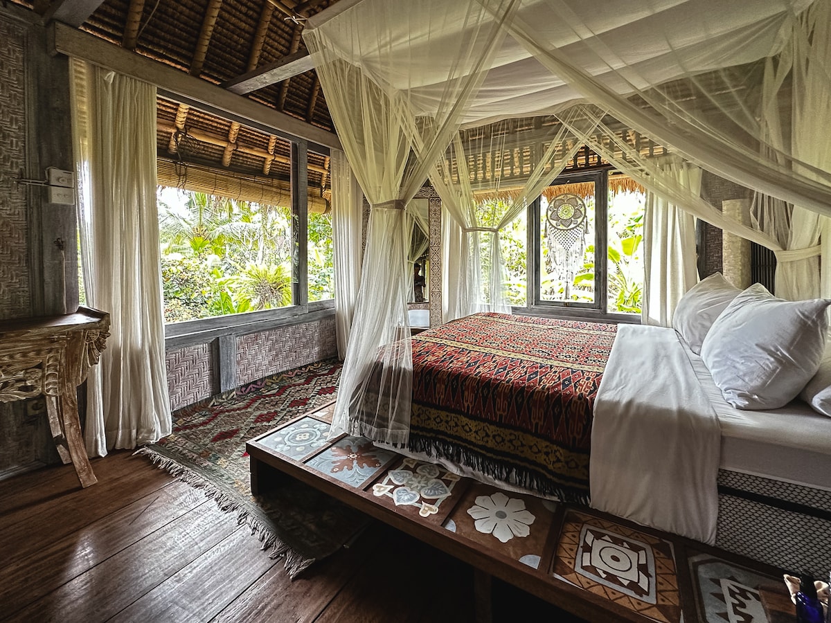 BARONG is a spacious furnished garden sanctuary in Penestanan, Ubud, ideal for monthly stays, remote work, or longer visits to Bali. Walking distance to Alchemy Yoga Center, cafés, and BGS, the home offers a peaceful setting surrounded by greenery while remaining close to Ubud Center. A suspended loft bedroom with large windows overlooks lush greenery, with a cozy daybed below. Enjoy a big open-air kitchen perfect for cooking, hammocks on the terrace, and a koi pond and fountain.