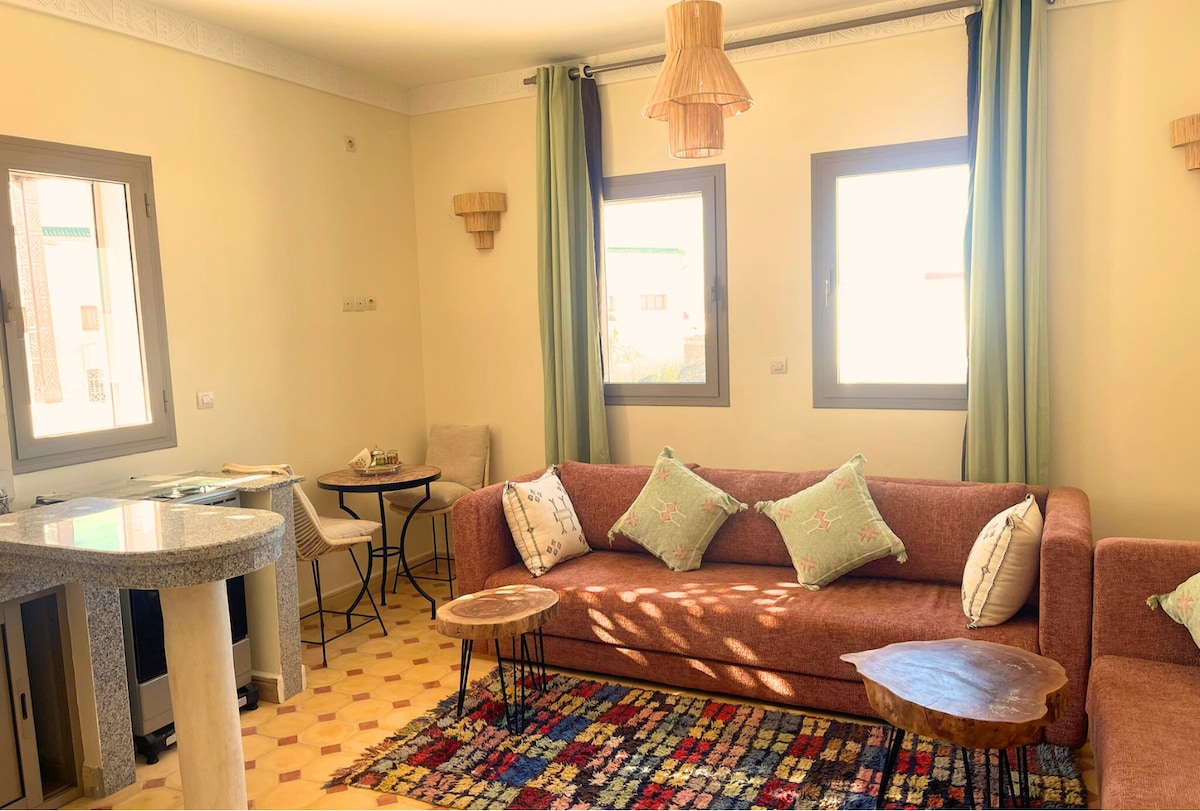 This one-bedroom apartment is perfect for solo travellers, couples, and surfers. The apartment is decorated with a minimalist style and features a spacious bedroom with a queen-size bed and ample storage space. The living room is bright and airy with 2 sofa beds, TV and kitchenette. The apartment is located in the heart of Tamraght, near "Hey Yallah Cafe" Walking distance from Devil's Rock, and a variety of shops, cafes & amenities