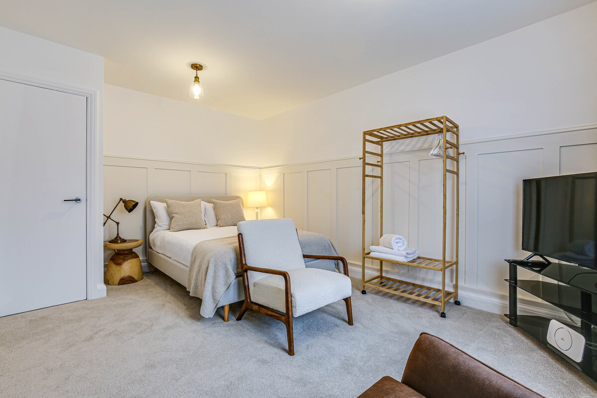 Bienvenido a Skyfall, una suite de invitados contemporánea, con una pequeña cocina que incluye microondas, mininevera y fregadero. Hay aparcamiento disponible. El alojamiento incluye un dormitorio grande con cama tamaño king con baño moderno en suite, gran ducha a ras de suelo, cocina pequeña y todas las comodidades, incluidos elementos esenciales modernos como banda ancha ultrarrápida y acceso a Netflix.