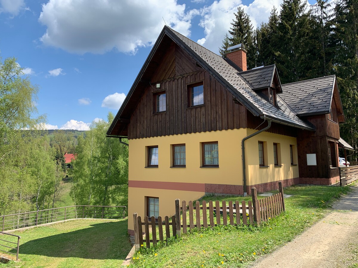 Vítáme Vás v novostavbě horské chalupy, situované na úbočí Bínova vrchu (699 m n. m. ) v Resortu pod Špičákem na území Chráněné krajinné oblasti Jizerské hory. Chalupa leží přímo u turistické stezky. Les hned u chalupy. Bobování s dětma hned na svahu za chalupou. Skiareál Tanvaldský Špičák je vzdálen pouze 2 km, je největším lyžařským areálem Jizerek a nabízí 17 km sjezdových tratí. Jsme BABY FRIENDLY :-)