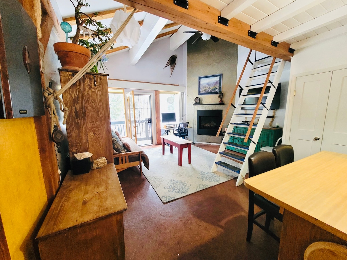 Nuestro cómodo apartamento estudio incluye: • Loft con cama tamaño queen accesible por escaleras empinadas. • Sofá cama tamaño queen en la sala de estar principal. • Baño con ducha y bañera. • Amplio espacio de almacenamiento. • Cocina compacta equipada. • TV, tocadiscos, tablero de dardos, libros y juegos. • Escritorio para sentarse/estar de pie • Balcón con parrilla. • Impresionantes vistas al río Hondo, pinos y álamos del bosque nacional Carson • Secador de pelo y mini tabla de planchar/plancha. • Lavandería compartida con lavadora, secadora, plancha y tabla grande en el sótano.