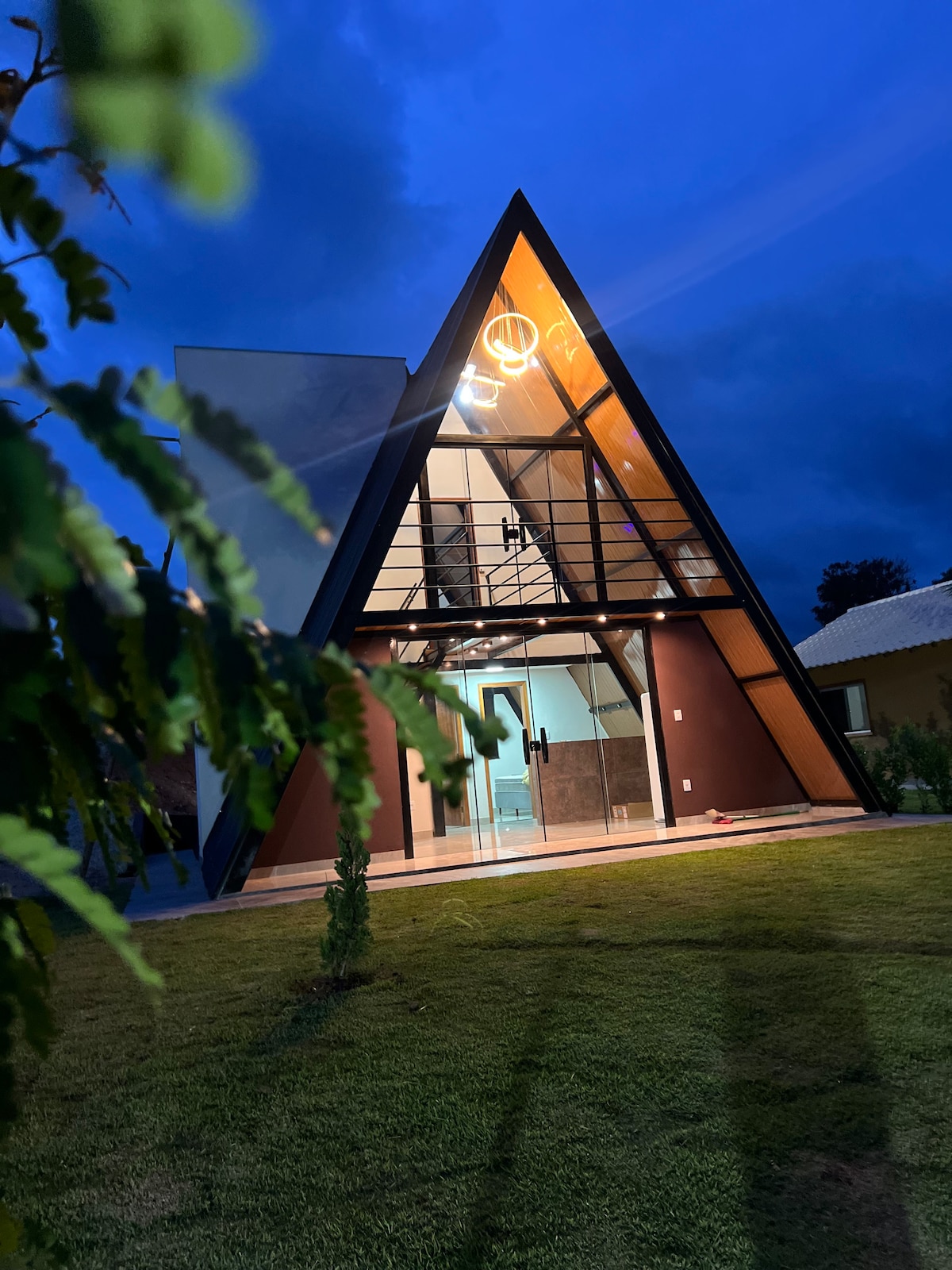 Nosso chalé combina a icônica estrutura triangular com um toque de modernidade industrial e aconchego em madeira. O que você vai amar: • Fachada de Vidro: Uma vista panorâmica que traz a natureza para dentro da sala. • Iluminação Cênica: Lustres modernos que criam um clima mágico ao cair da noite. • Mezanino Aconchegante: O espaço ideal para uma noite de sono tranquila com vista para as estrelas. • Área Externa: Um amplo gramado para relaxar ao ar livre e respirar ar puro.