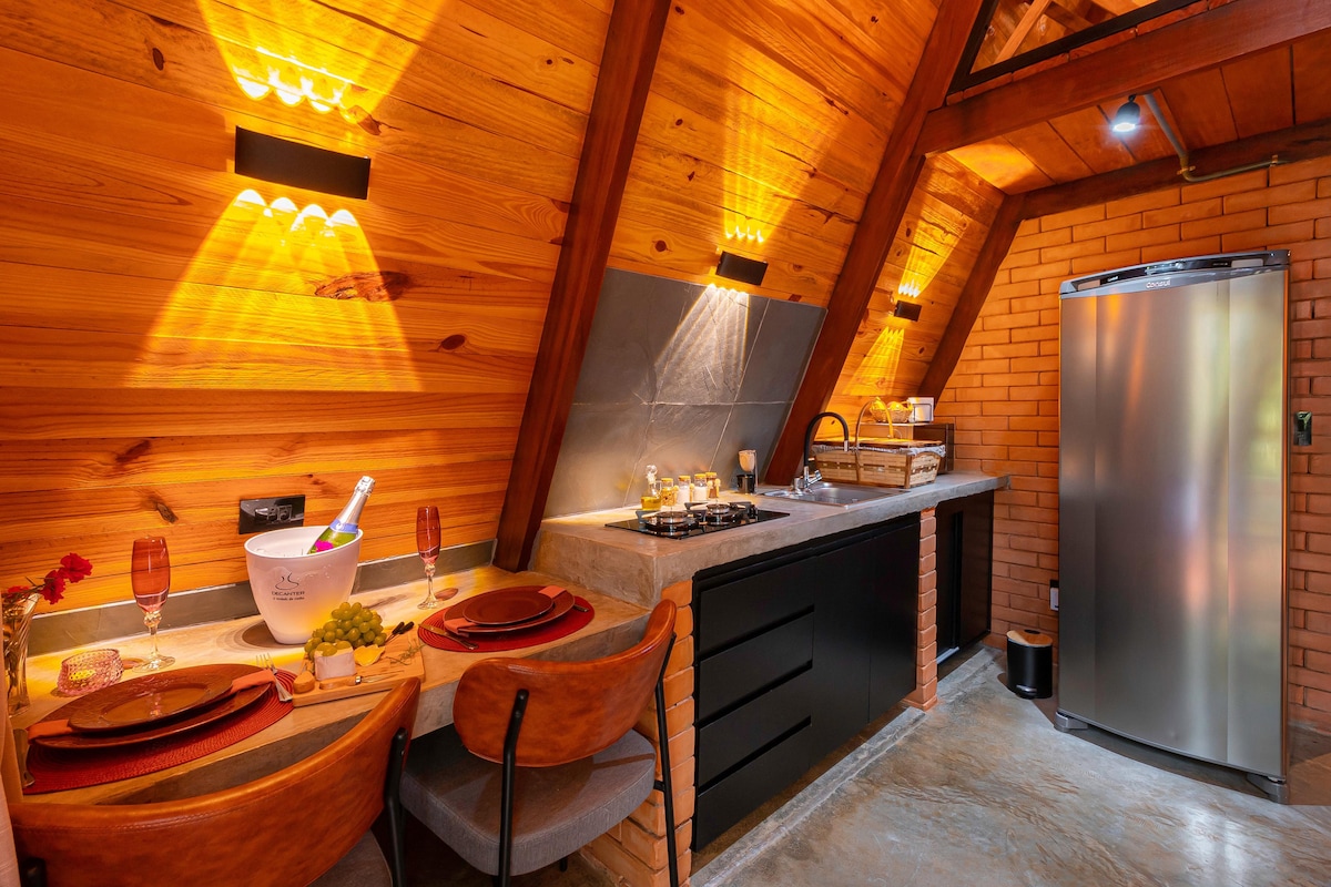 @oyachales - Casa dos Ventos. Cabaña con estructura en A, a 19 km de Piri, con capacidad para 4 personas con comodidad y privacidad. Planta baja: hay un dormitorio doble con aire acondicionado y TV inteligente, una acogedora sala de estar y una cocina totalmente equipada. Amplia terraza con jacuzzi. Planta superior: un dormitorio espacioso con aire acondicionado ofrece noches tranquilas y unas vistas impresionantes de Chapada de Pirenópolis. La zona de la hoguera, con una fogata y columpios, es perfecta para momentos de ocio bajo el cielo estrellado.