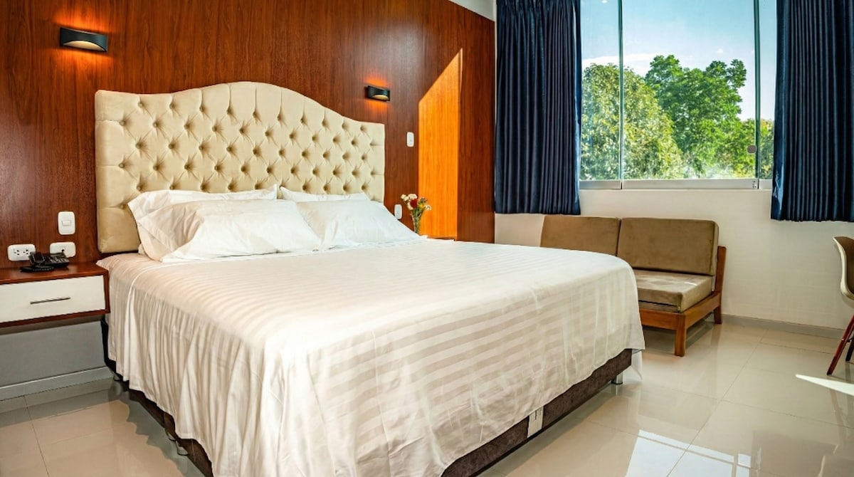 Cómoda habitación independiente de 23 m2. Cuenta con un Smart TV 32" con conexión a internet y TV/Cable, Frigobar, Aire Acondicionado para los días calurosos y Vista hacia los jardines. La tarifa de la habitación incluye desayunos, además de poder usar nuestras áreas comunes: Piscina, Cochera, Zona de Hamacas, WIFI, Restaurante y atención las 24 horas del día. CasaBosque es el mejor lugar para relajarte y conectar con la naturaleza a solo 5 minutos del centro de Tarapoto. Te esperamos!