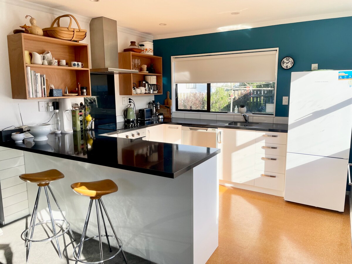 Soleada, espaciosa y cálida, con colores vibrantes por dentro y por fuera, Sunset Beach House tiene una mezcla de muebles vintage y modernos, y todo lo que puedas desear para unas vacaciones o una escapada en la hermosa playa de Otaki. Totalmente equipada con cuatro amplios dormitorios en una sección de un cuarto de acre, hay mucho espacio para estirarse y relajarse. Una casa para todas las estaciones, disfruta de tranquilos paseos por la playa, sol, surf y arena en verano, o acércate al fuego en invierno y disfruta de la nieve en las hermosas Tararuas.