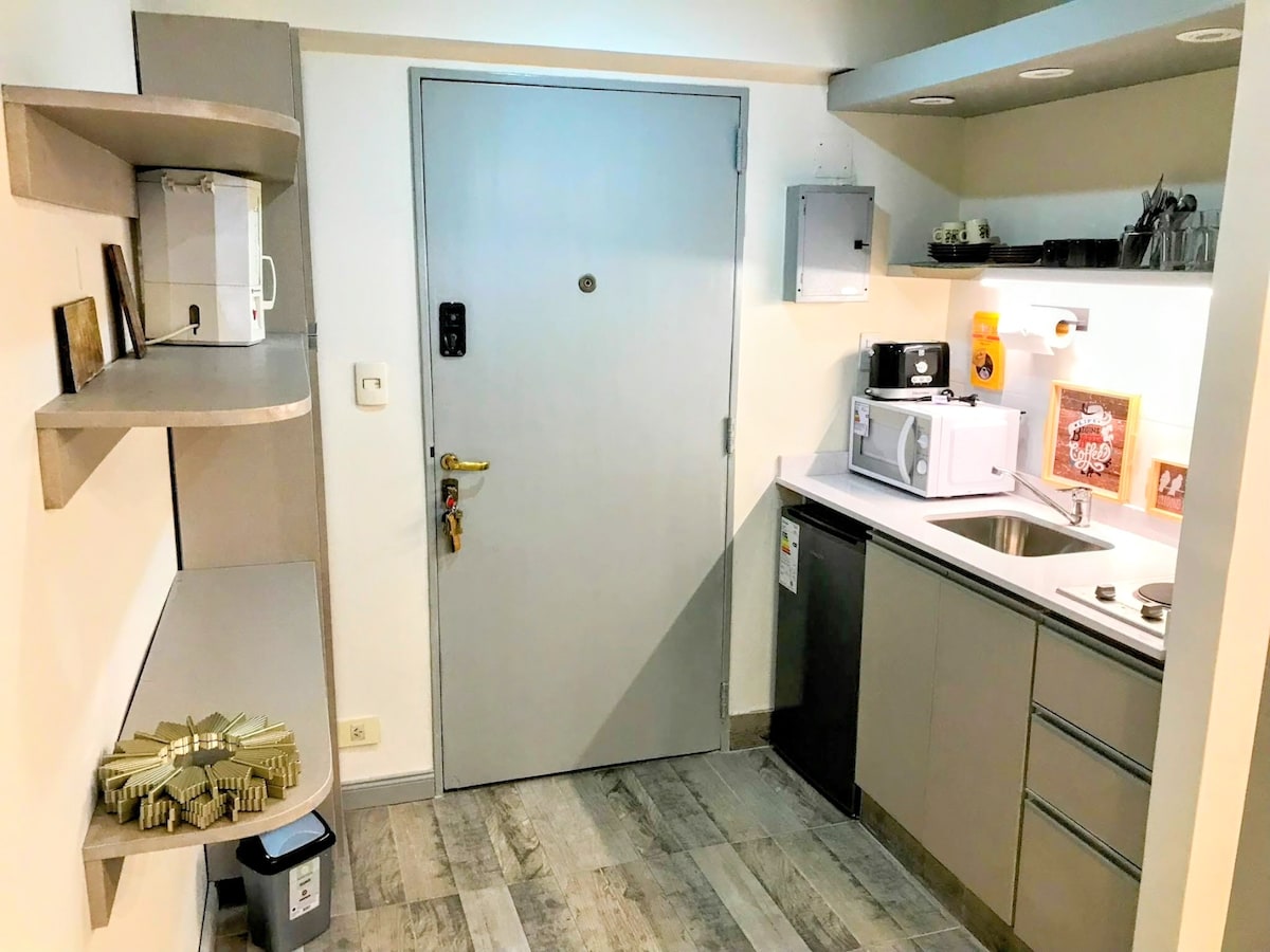 Este hermoso estudio se encuentra sobre la Avenida Corrientes, a metros del Obelisco y de los principales teatros de Bs. As. El edificio es un antiguo hotel que tiene seguridad las 24 HS. y un bar en la recepción. También cuenta con laundry en el piso 3. El estudio fue reciclado a nuevo, y tiene una gran vista a la avenida. Cuenta con cocina totalmente equipada, microondas, anafe eléctrico, cafetera, heladera y utensilios. TV Smart, wifi. Cama tamaño king o dos camas individuales. Impecable.
