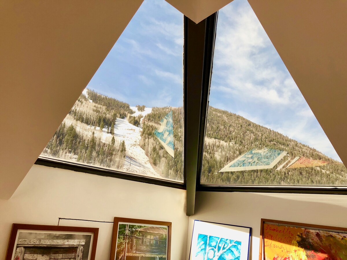 SUNNY TOP-FLOOR TELLURIDE STUDIO LOFT - WALK TO FESTIVALS & EVERYTHING! - Prime Telluride spot—short walk to TOWN PARK, Main St shops/restaurants, Clarks Market, trails, gondola - HOT TUB (shared) -NO CAR NEEDED! - QUIET end-unit top floor - Epic MOUNTAIN VIEWS - SUNNY! - COZY queen sleeping loft & sofa sleeper - Ideal for BLUEGRASS, Jazz/Mushroom, FILM, BLUES&BREWS FESTIVALS, July 4th, Thanksgiving, Christmas & Spring/Fall escapes! - LIMITED PEAK DATES Book your festival getaway now!
