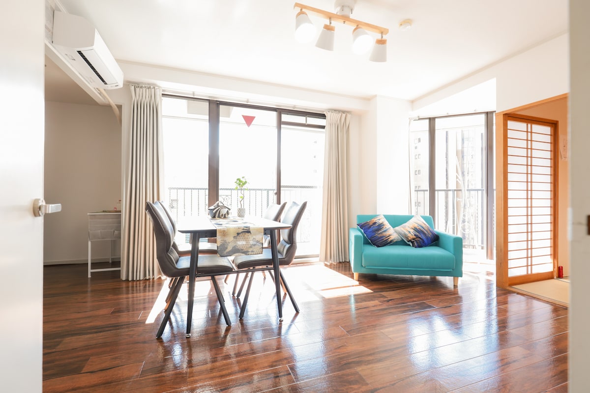 La habitación tiene 31 m2, limpia y acogedora, ubicada a 2 minutos a pie de la estación de metro y la parada de autobús directo al aeropuerto, a 3 minutos. Namba y Dotonbori a 5 minutos en metro. Este edificio se encuentra en el centro de la ciudad, puede sonar el ruido del tráfico y la construcción durante el día. La policía y sirena de ambulancia incluso a medianoche. Sobre la cuna, cuesta 1000 yenes por 1 noche, la silla de bebé cuesta 1000 yenes por tu estancia. Si los niños ensucian mucho la alfombra y la pared, se añadirá un cargo de limpieza adicional (5000 yenes) Este edificio tiene ascensor hasta la habitación.