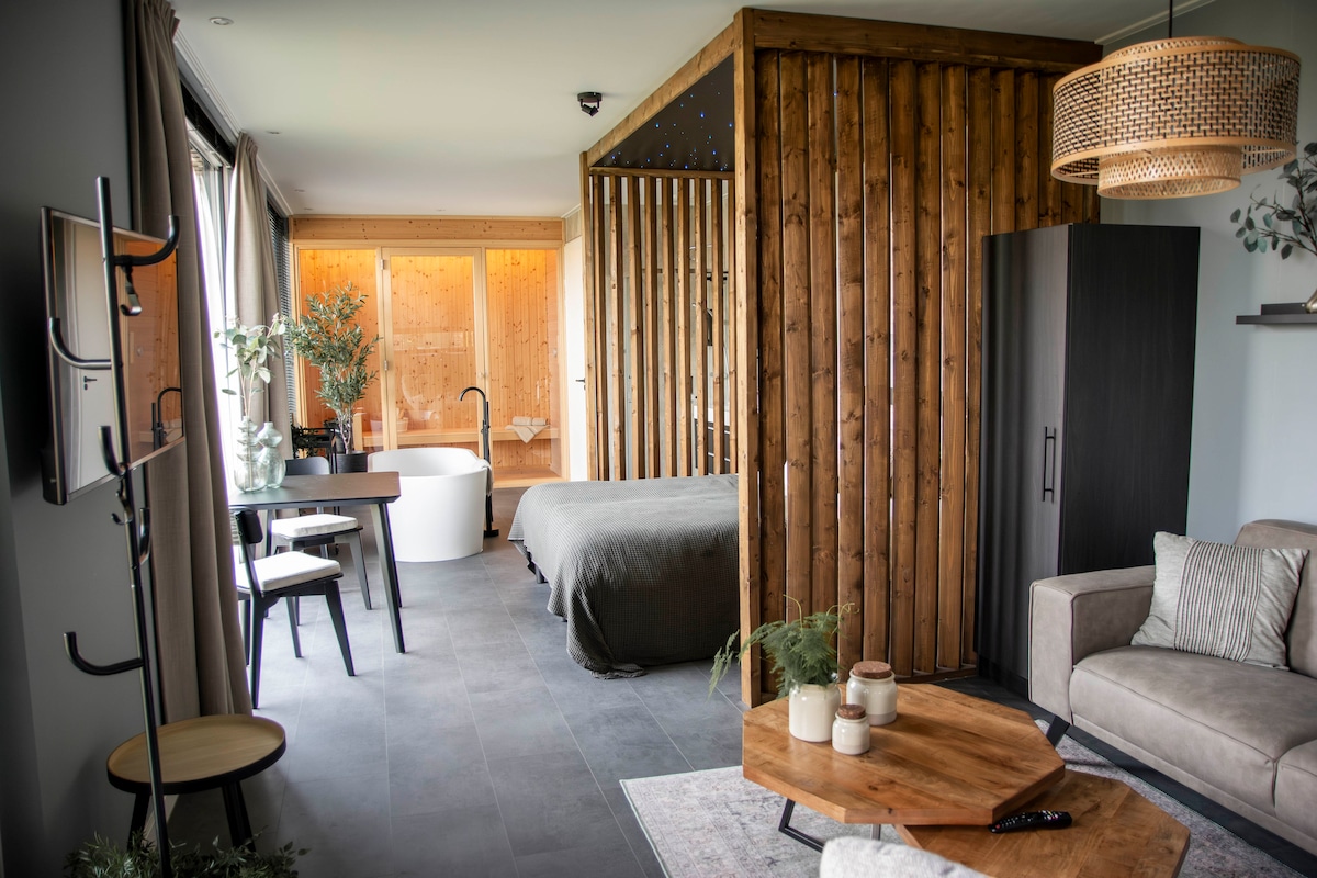 Bienvenido a la tranquila Wellnesshuisje en el bosque de Veluwe. ¿Es hora de retirarse, relajarse y recargarse? ¡Entonces nuestra elegante Wellness Cabin con sauna es para ti! Relájate por completo tumbándote en el baño caliente. Recarga las pilas en la sauna de infrarrojos o disfruta de la agradable ducha de efecto lluvia. Apaga el despertador y despierta con una vista de los hermosos árboles. El bosque está casi a tus pies. Date el gusto.