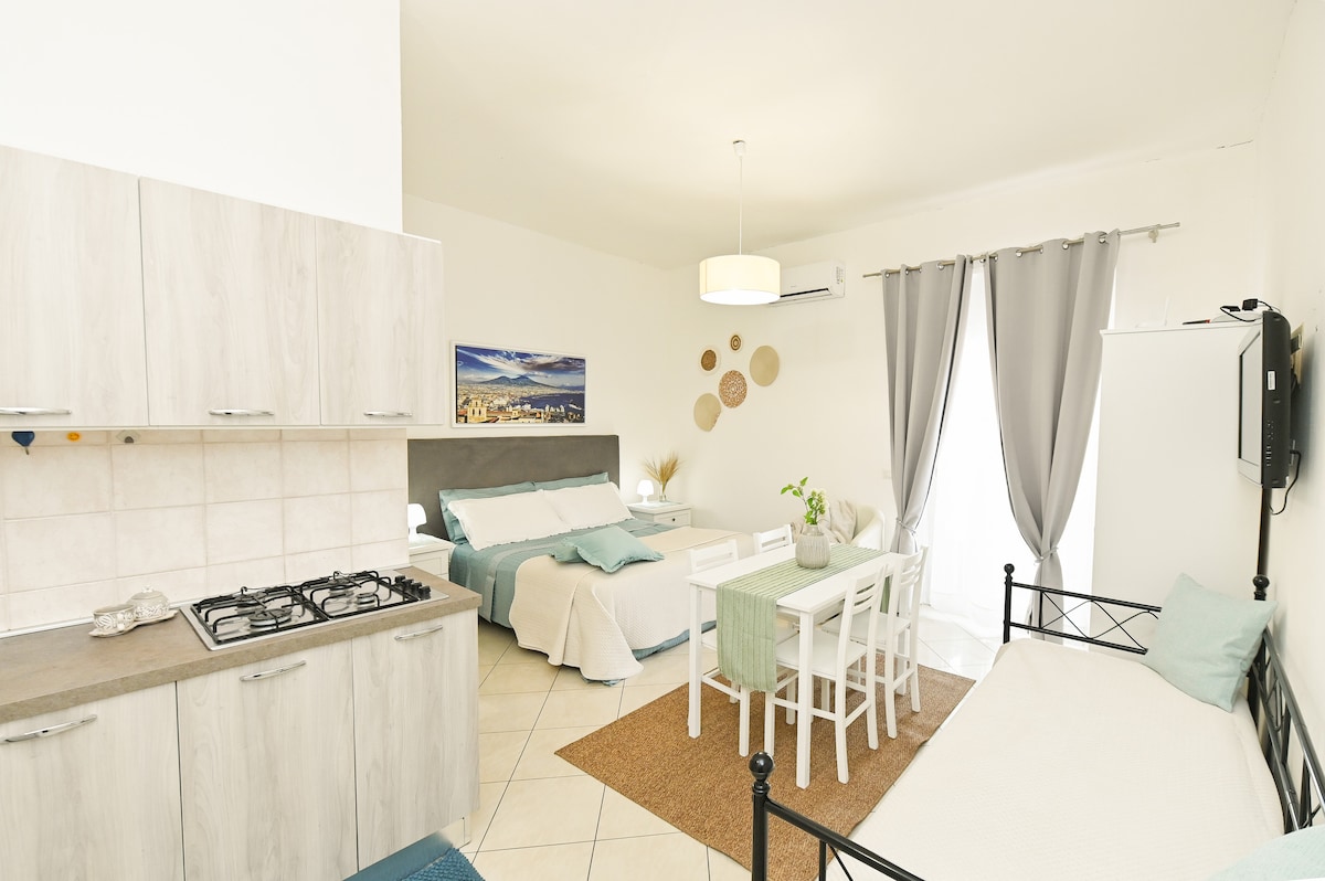 Dependencia que consta de entrada con cocina americana, baño y dormitorio. Desde todas las habitaciones se puede disfrutar de una vista panorámica del Vesubio. El inmueble dispone de aire acondicionado, wifi gratuito y una pequeña terraza en la parte delantera. Se encuentra a 10 km de Pompeya y a 25 km del aeropuerto de Capodichino. La zona en la que se encuentra está bien comunicada con bares, farmacias y restaurantes, y está a pocos pasos de la Circumvesuviana, con la que se puede llegar rápidamente a Pompeya, Herculano, la costa de Amalfi y Sorrento.
