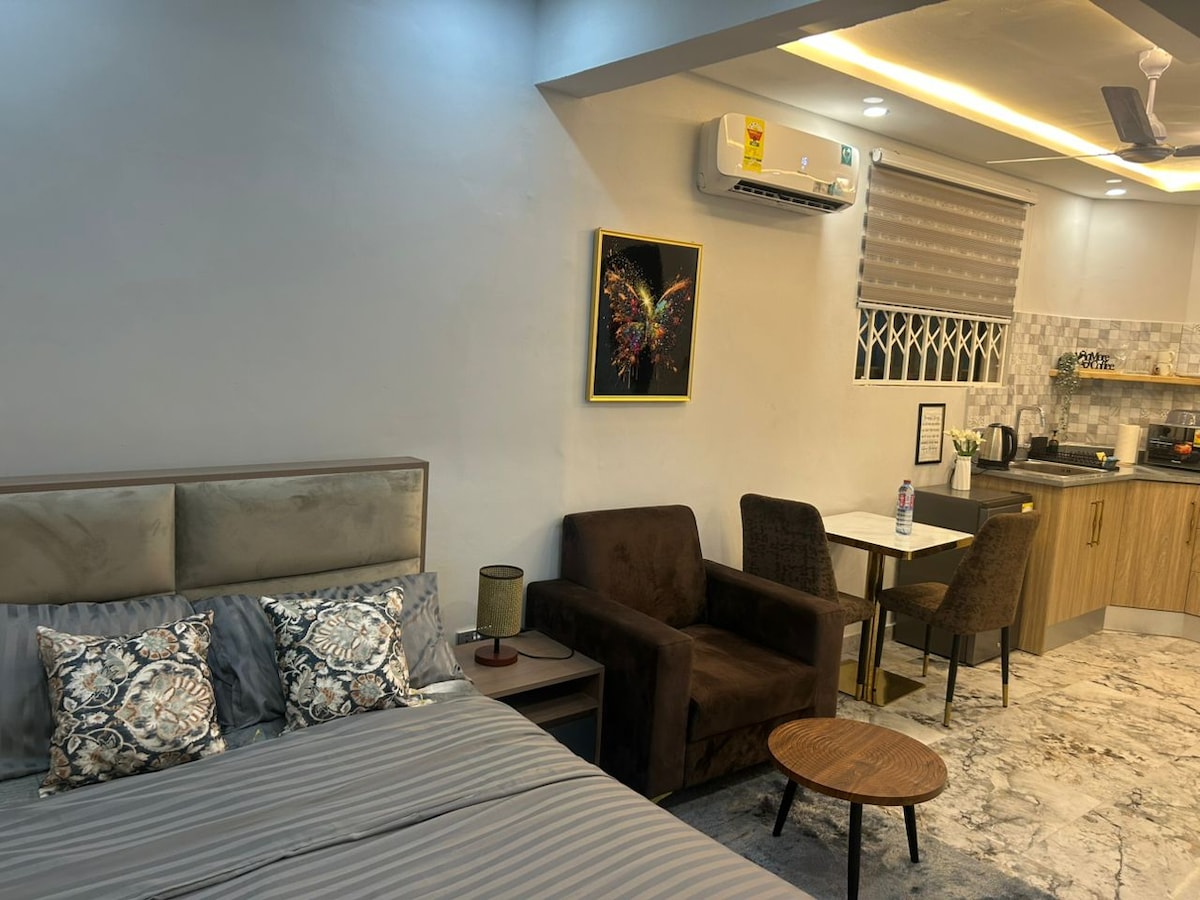 Bienvenido a The Olive by Huis Hospitality, un estudio de primera calidad ubicado en Embassy Gardens, Cantonments. Este amplio estudio de diseño elegante ofrece una mezcla perfecta de comodidad, funcionalidad y lujo moderno. Seleccionado cuidadosamente para alojar a los huéspedes con una isla comedor, una estación de trabajo dedicada y un balcón privado con asientos al aire libre, esta es una de las unidades de estudio más grandes de Embassy Gardens.