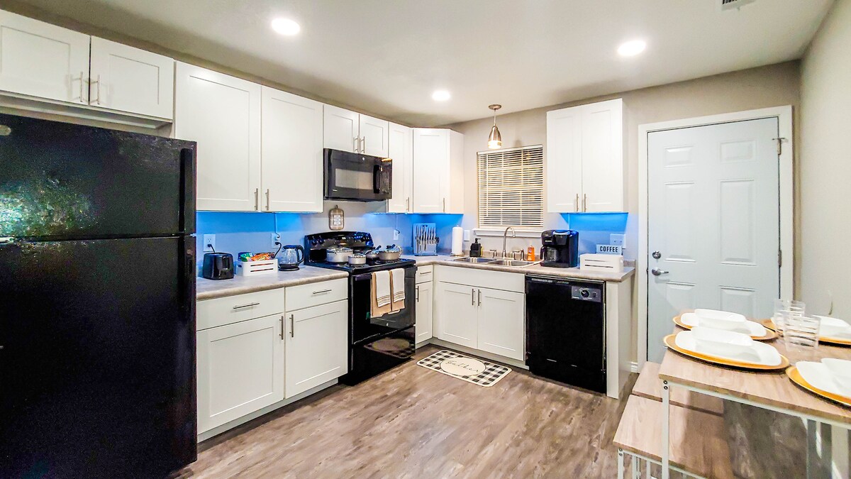 A serene haven where comfort meets style. Sink into plush beds with luxurious 700-thread ct European cotton sheets. TV in each room. A fully stocked kitchen awaits, & coffee to start your day. Within 10 minutes of hospitals, convention centers, eateries, and shopping. For those blending work & leisure, enjoy great internet, a dedicated desk, charging station, & a comfortable office chair. The garage provides shelter for a vehicle and doubles as a recreational space with a ping pong table.