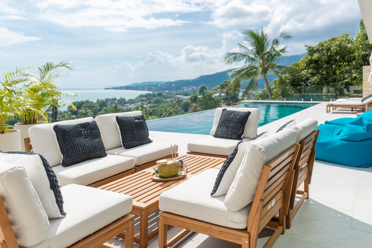 Villa privada de lujo de 620 m² con vistas al mar de 180° sobre las colinas de Chaweng → Desayuno y limpieza diarios. Piscina infinita de→ 25 metros de altura. → Gimnasio, billar, dardos y tenis de mesa → Hospitalidad con personal 24/7 en el lugar (inglés, tailandés) Bañera de hidromasaje de→ hormigón → Cada dormitorio con baño privado Internet → de alta velocidad y wifi → Televisión inteligente con Netflix Sistema de sonido→ Bose → Café y agua potable gratis → Agua y electricidad incluidas → 10 millones en auto a las playas → Más servicios disponibles bajo petición