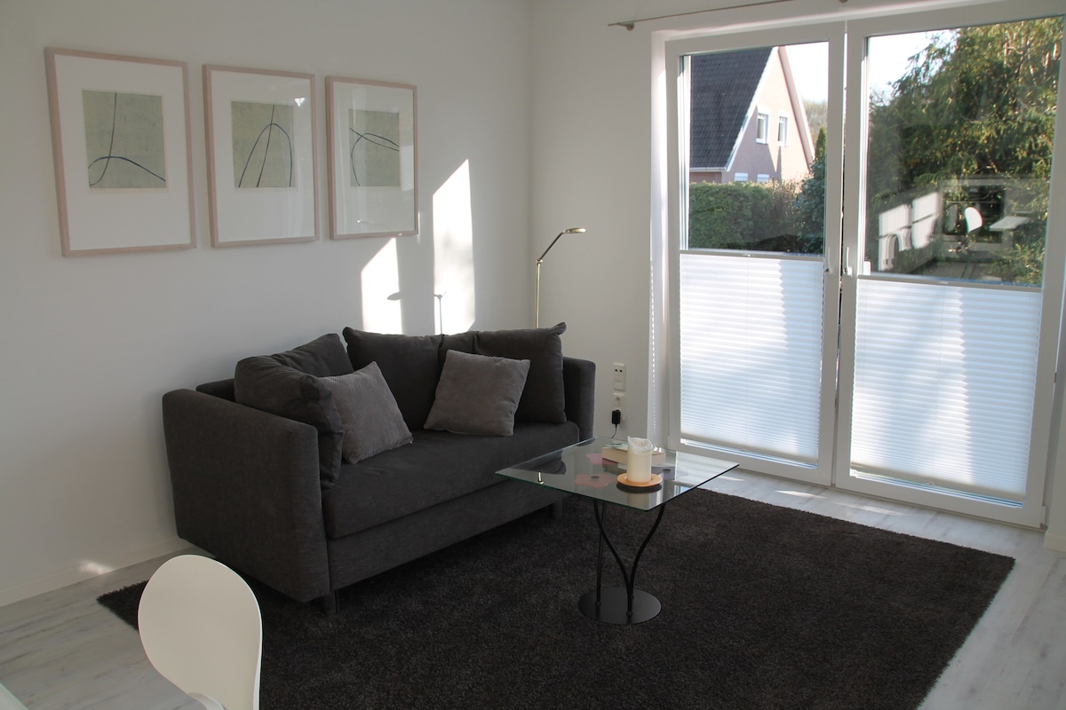 Apartamento de 2 habitaciones (nuevo) en una zona residencial muy solicitada, con una superficie habitable de unos 50 metros cuadrados, cerca de la universidad y del casco antiguo, justo al lado de una reserva natural, equipamiento de alta calidad, cocina de diseño, 4 plazas para dormir (cama doble de 2 x 2 m, sofá cama y cama de invitados), suelo con certificación «Blauer Engel», aparcamiento y terraza.