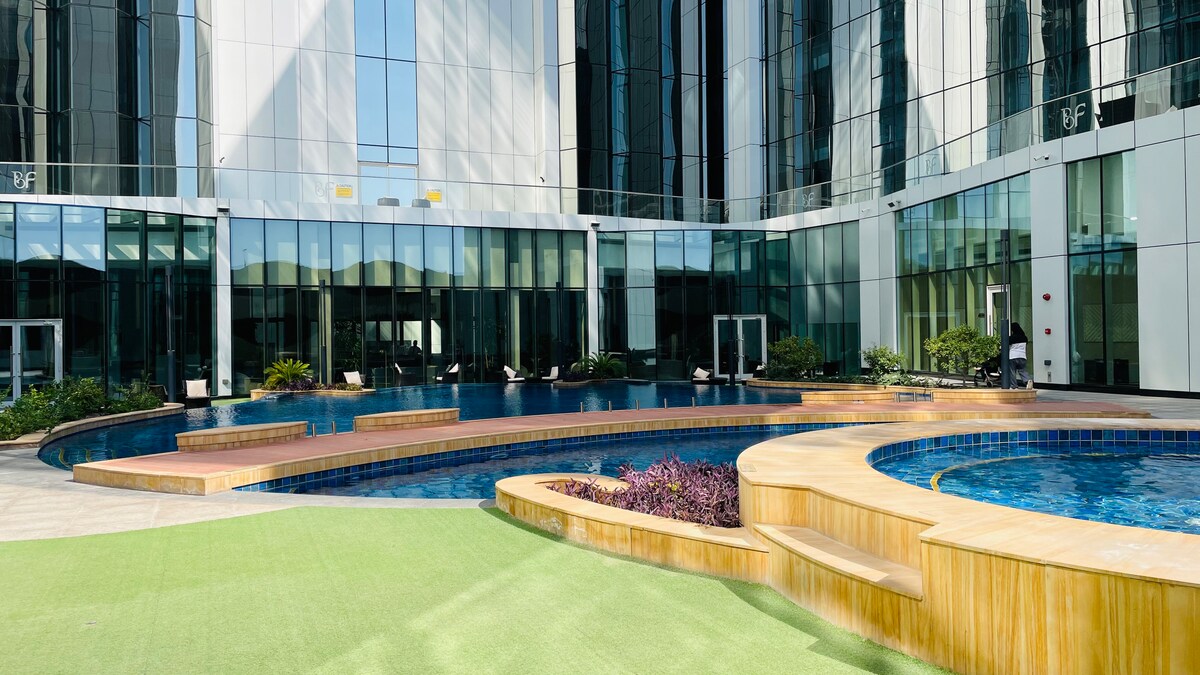 Disfruta de una experiencia de lujo en este céntrico alojamiento en el corazón de Bahrein Bay, cerca de lugares emblemáticos como el hotel Four Seasons, Avenues Mall y Moda Mall. El apartamento estudio cuenta con acceso a una hermosa piscina, un cine que se puede reservar solo para ti, gimnasio, jacuzzi y sala de juegos. La ubicación de lujo del edificio está cerca de restaurantes de alta cocina y cafeterías para disfrutar de la mejor experiencia de visitar Baréin.