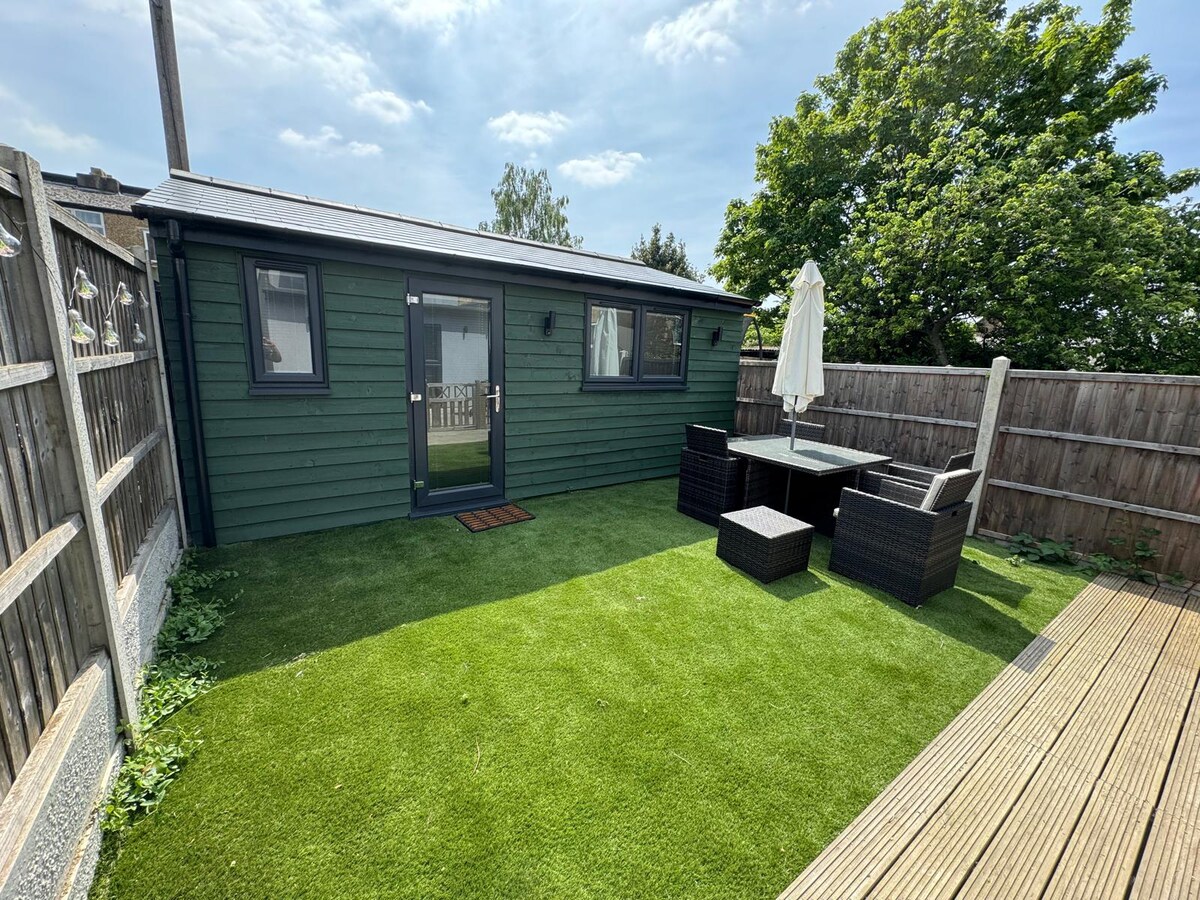 Cabaña al final de nuestro jardín. Entrada privada y zona exterior cubierta con asientos. Pequeña cocina con utensilios básicos de cocina. Cama tamaño king y un pequeño sofá cama doble adecuado para un adulto o dos niños más pequeños. Baño independiente con ducha a ras de suelo. Unidad de aire acondicionado/calefacción para tu comodidad durante todo el año. A 3-4 minutos a pie del metro de Woodford en la línea central y de restaurantes, cafeterías y supermercados en Woodford Broadway. Aparcamiento gratuito en la calle y en la calle.