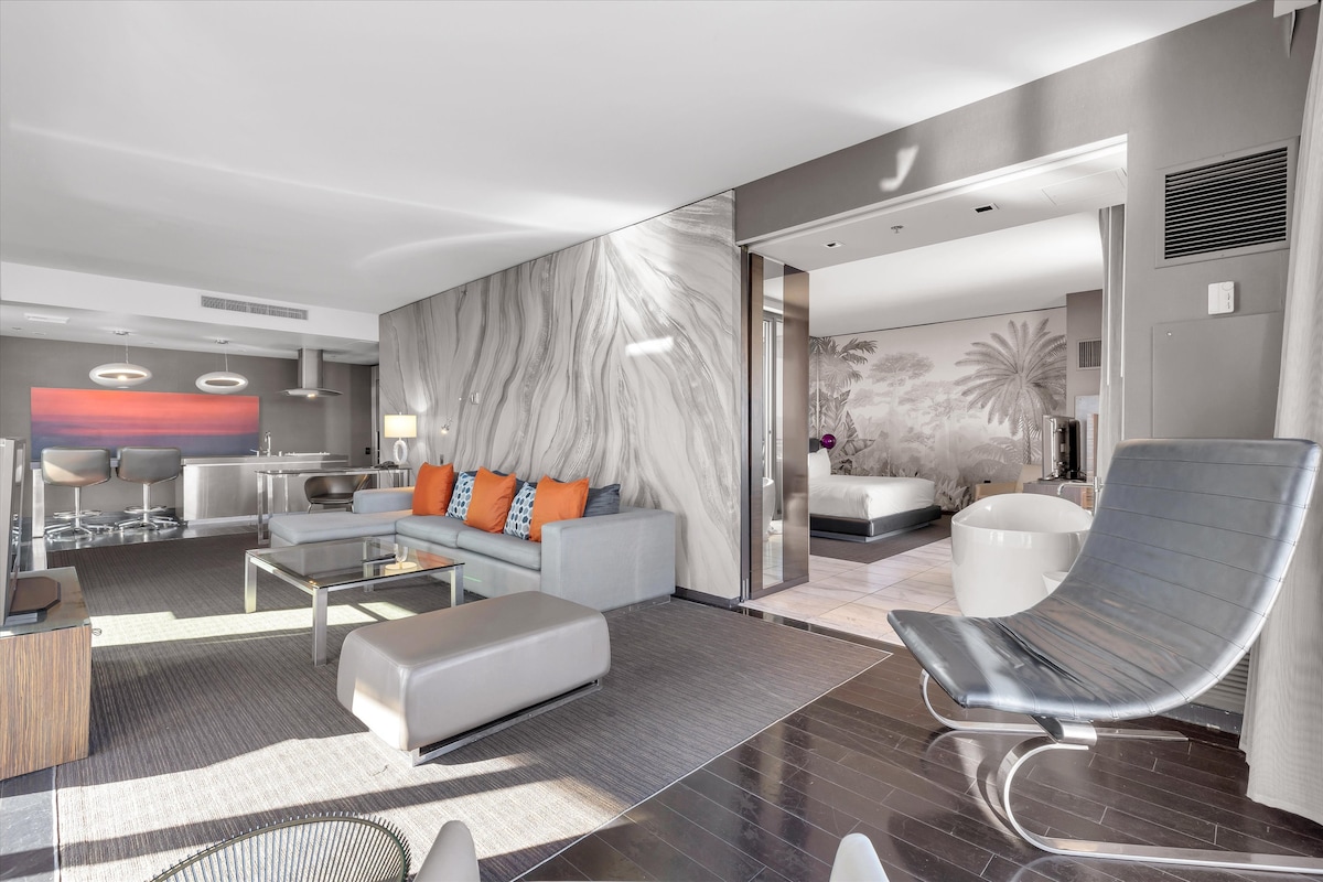 Disfruta de una suite única en Las Vegas... Impresionante diseño y decoración con muebles de lujo con un toque de mediados de siglo. El plano de planta de concepto abierto tiene 2 dormitorios/2 baños y una amplia superficie de 2100 pies cuadrados. Disfruta de entretenimiento las 24 horas en la mesa de billar de acero inoxidable y el juego de cócteles de varios lados (los mejores juegos clásicos de los 80/90). La sala de estar tiene un gran sofá seccional, televisores LG de 65 pulgadas e iluminación LED en todas partes. La terraza envolvente tiene vistas a la piscina interior/exterior y al Strip de Las Vegas.