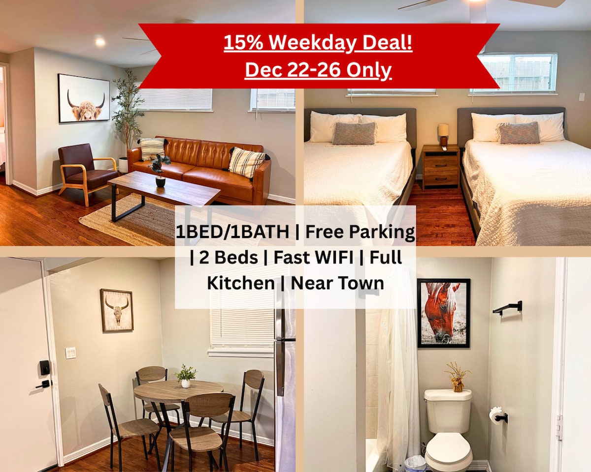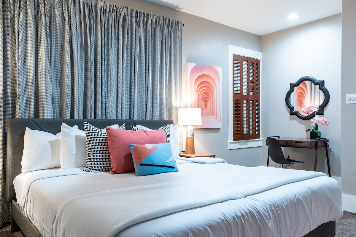 ¡Te damos la bienvenida a tu retiro en Montrose! Este loft de 2 dormitorios/1B cuenta con cómodas camas tamaño king, estacionamiento gratuito y wifi rápida. Relájate en la acogedora sala de estar con dos sofás, TV y zona de trabajo. Disfruta del patio privado o cocina en la cocina completa con una estufa de gas. Situado en el corazón de Houston, estás a pocos minutos de los mejores restaurantes, bares, museos y estadios. Ya sea que estés aquí para explorar o relajarte, ¡te encantará el espacio luminoso y acogedor!