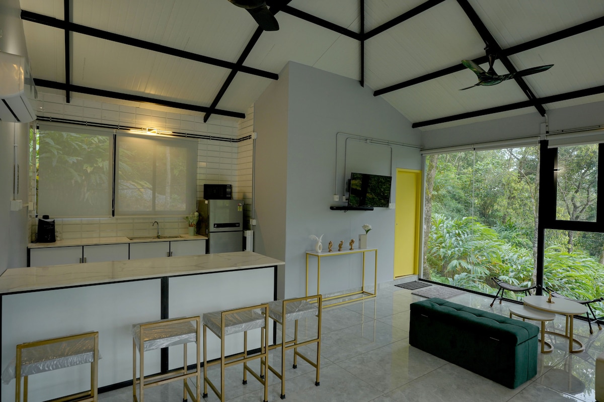 Disfruta del tiempo con tus seres queridos en esta villa con piscina privada en medio de una exuberante vegetación y una pintoresca plantación de cardamomo. La cabaña cuenta con dos dormitorios con baños adjuntos, junto con una acogedora sala de estar, comedor y cocina pequeña. Todas las habitaciones están cuidadosamente diseñadas para ofrecer lujo, comodidad y privacidad a los huéspedes. Despierta con la relajante melodía de los pájaros y la música del arroyo cercano