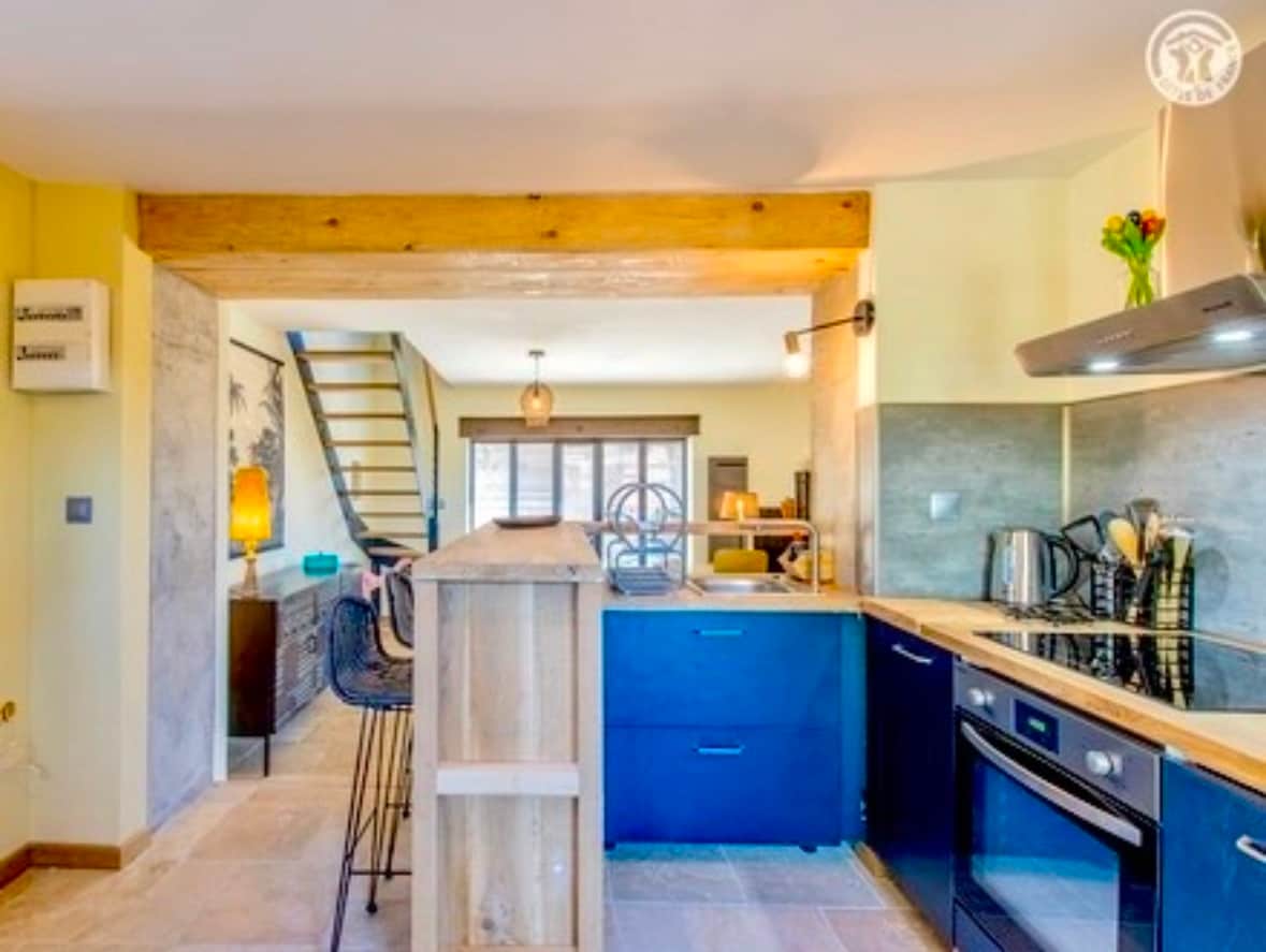 La antigua casa situada en pleno campo ha sido completamente renovada. Puede alojar a un grupo de hasta 12 personas. La planta baja consta de una cocina moderna totalmente equipada abierta a un comedor y luego una sala de estar. Una habitación y un baño se encuentran en la misma planta. Arriba hay otros 4 dormitorios, así como dos baños y luego un aseo. Una gran terraza y un gran jardín acompañan esta casa.